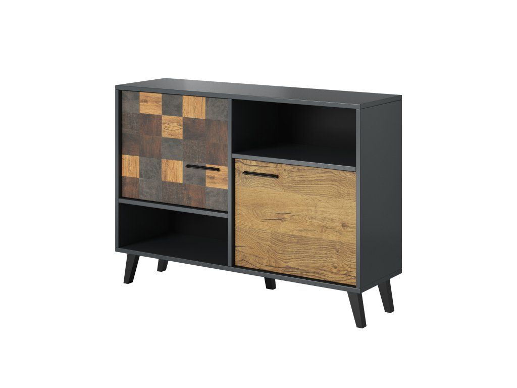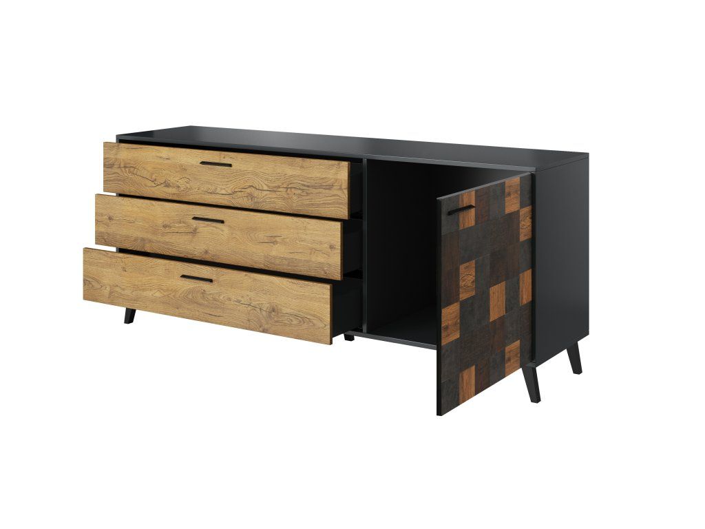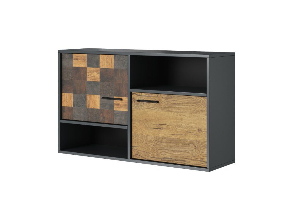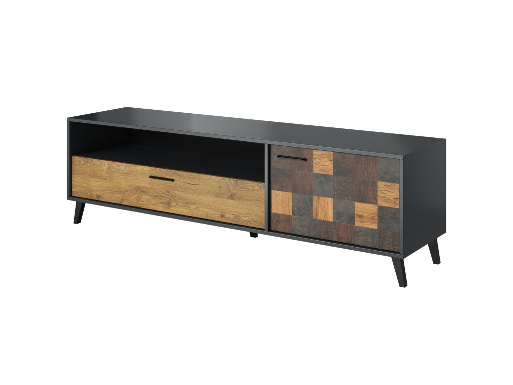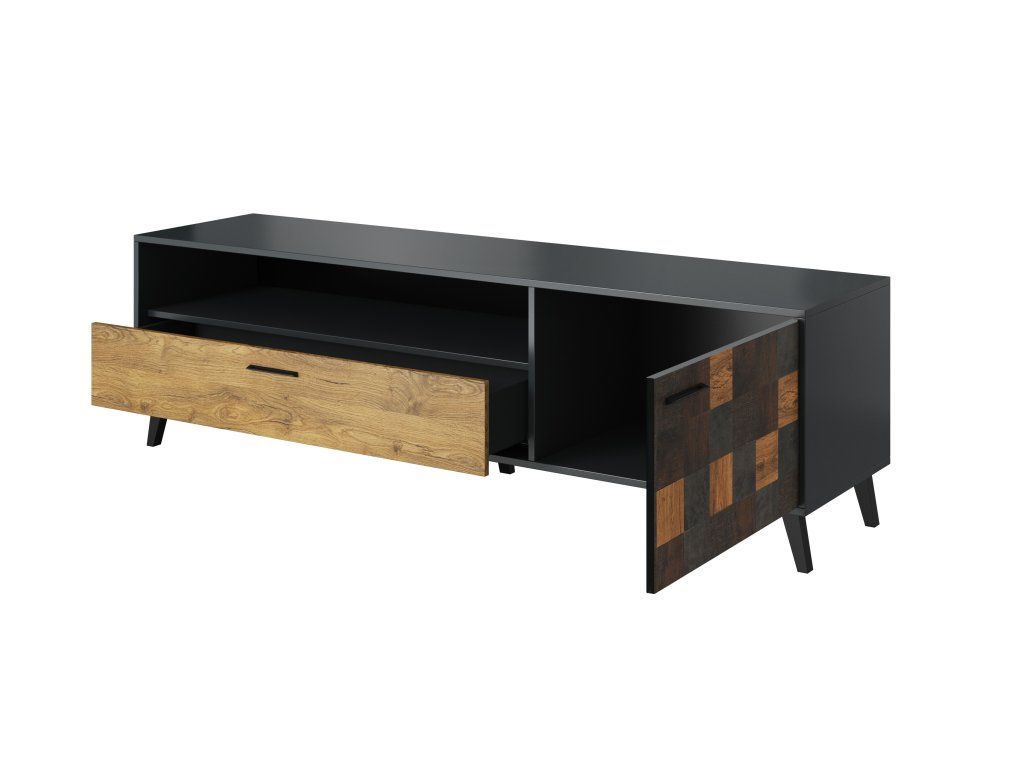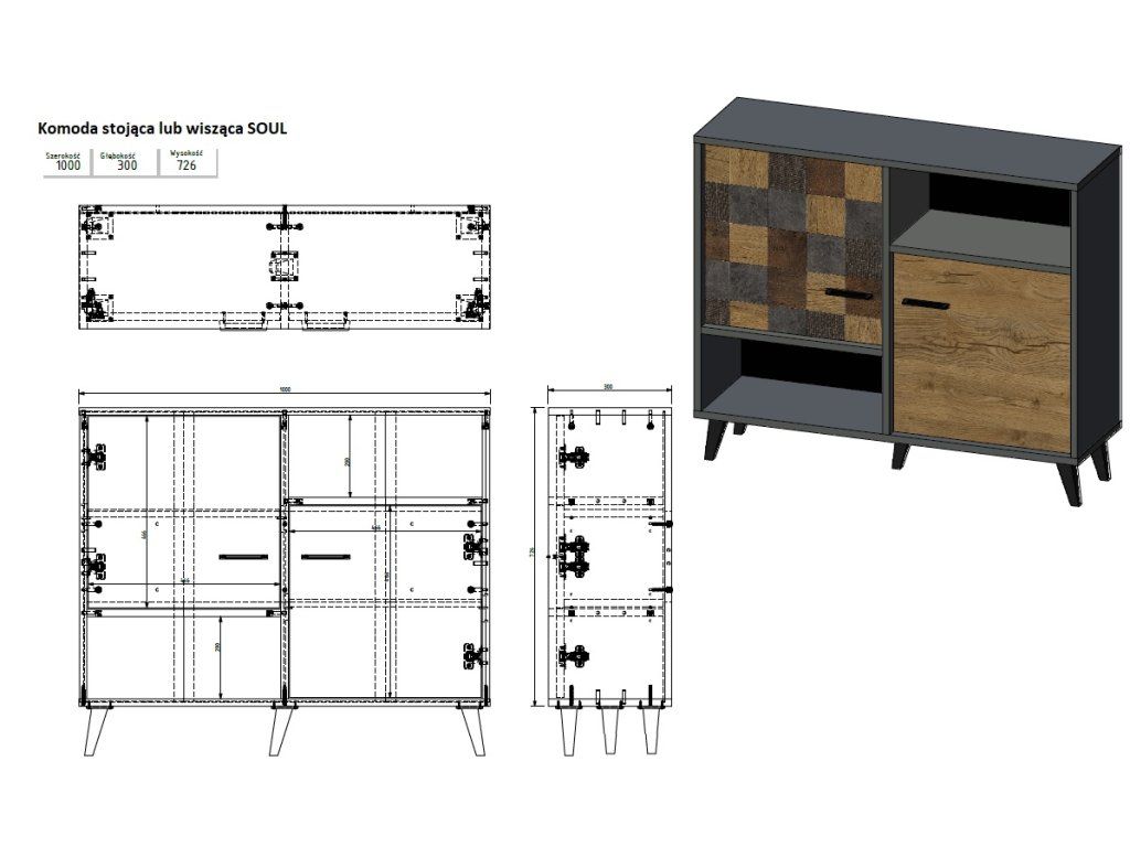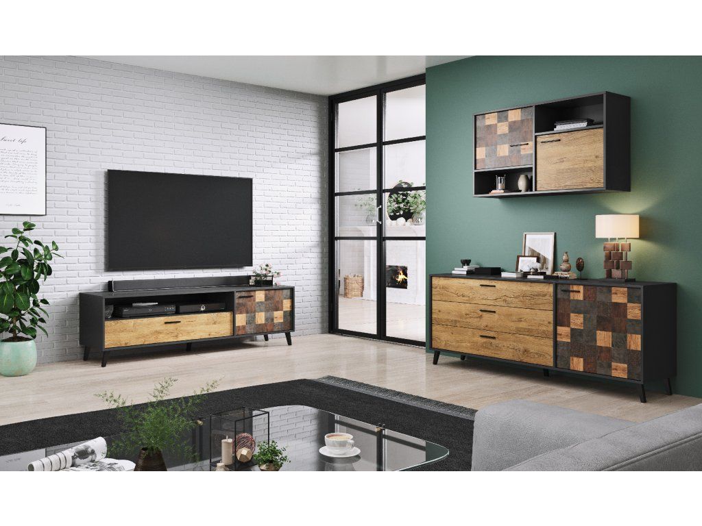 Tv stolek disponuje jednou zásuvkou a jednou uzavřenou policí. Stojící komoda má tři zásuvky a jedny dvířka a závěsná skříň Vám nabídne dvě otevřené police a dvoje dvířka s úložným prostorem.