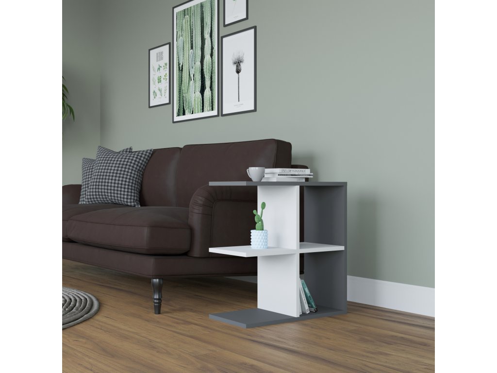 Dvoupatrový bílo-antracitový odkládací stolek HAMLET pojme spoustu drobností, a i bez jedné bočnice může sloužit například jako knihovna či noční stolek.