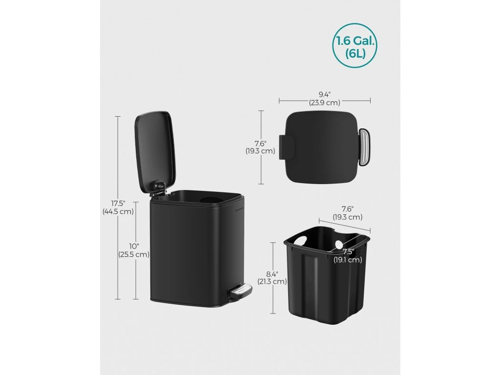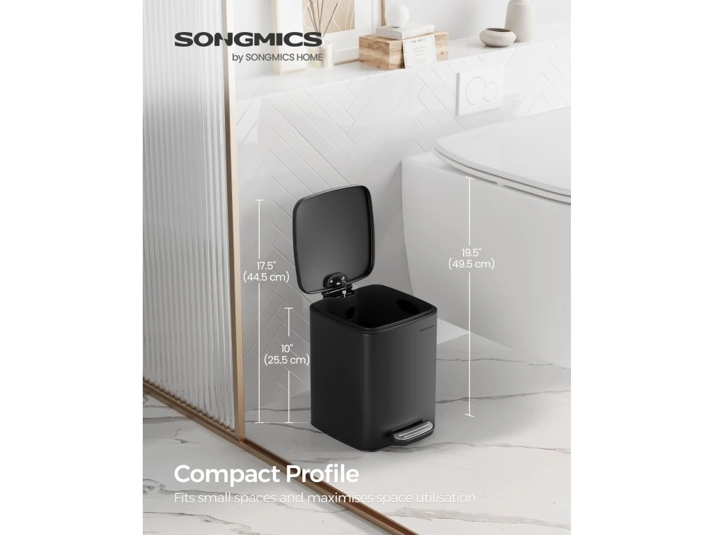 Díky svým kompaktním rozměrům (24 x 19,3 x 25,5 cm, D x Š x V) se tento šestilitrový koš perfektně vejde do malých prostor. Zabírá velmi málo místa na podlaze a stále nabízí dostatek místa pro váš odpad.