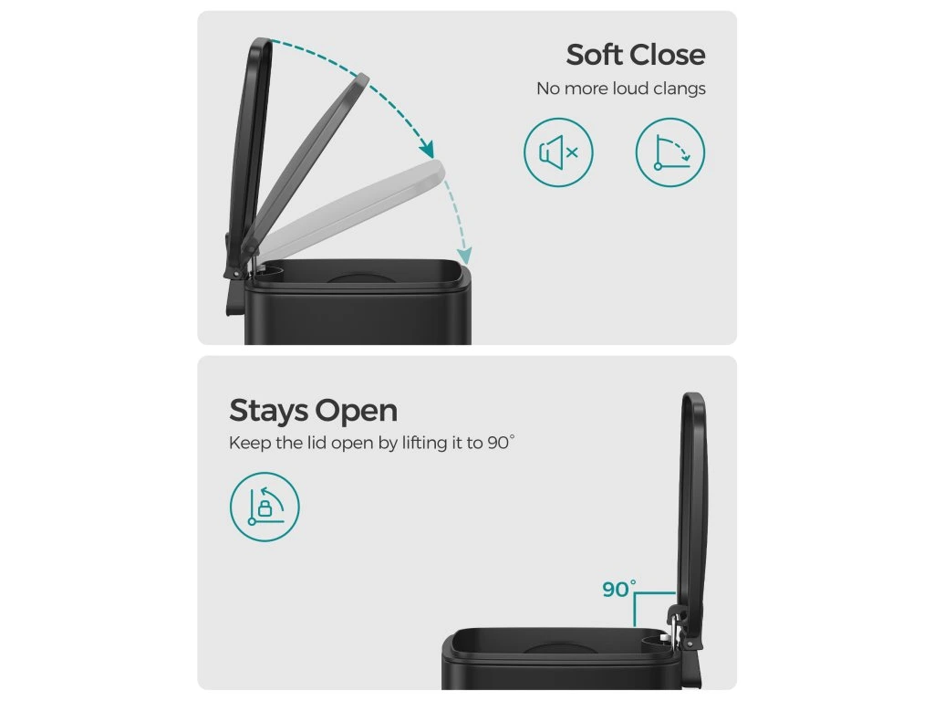 Víko tohoto malého odpadkového koše se zavírá tiše a jemně a nepřevrhne se náhle. V případě potřeby jej lze také nechat otevřené, což vám umožní snadno se zbavit odpadků.