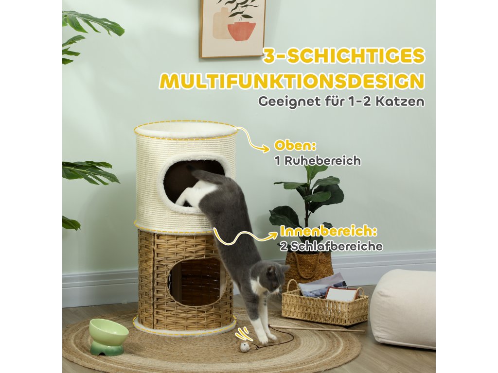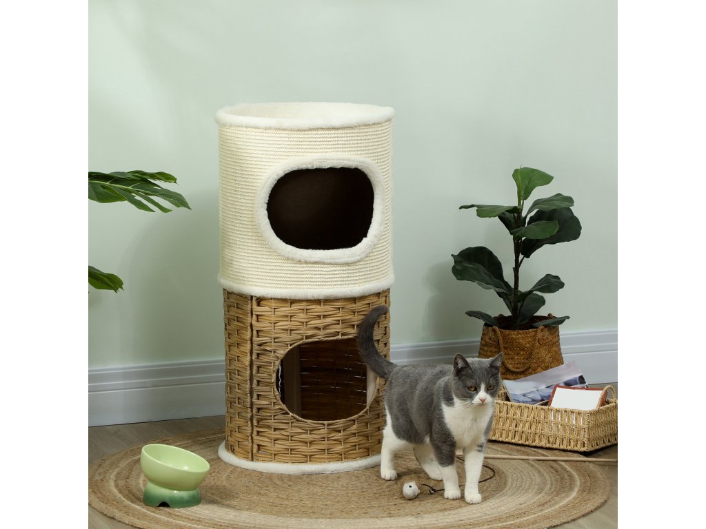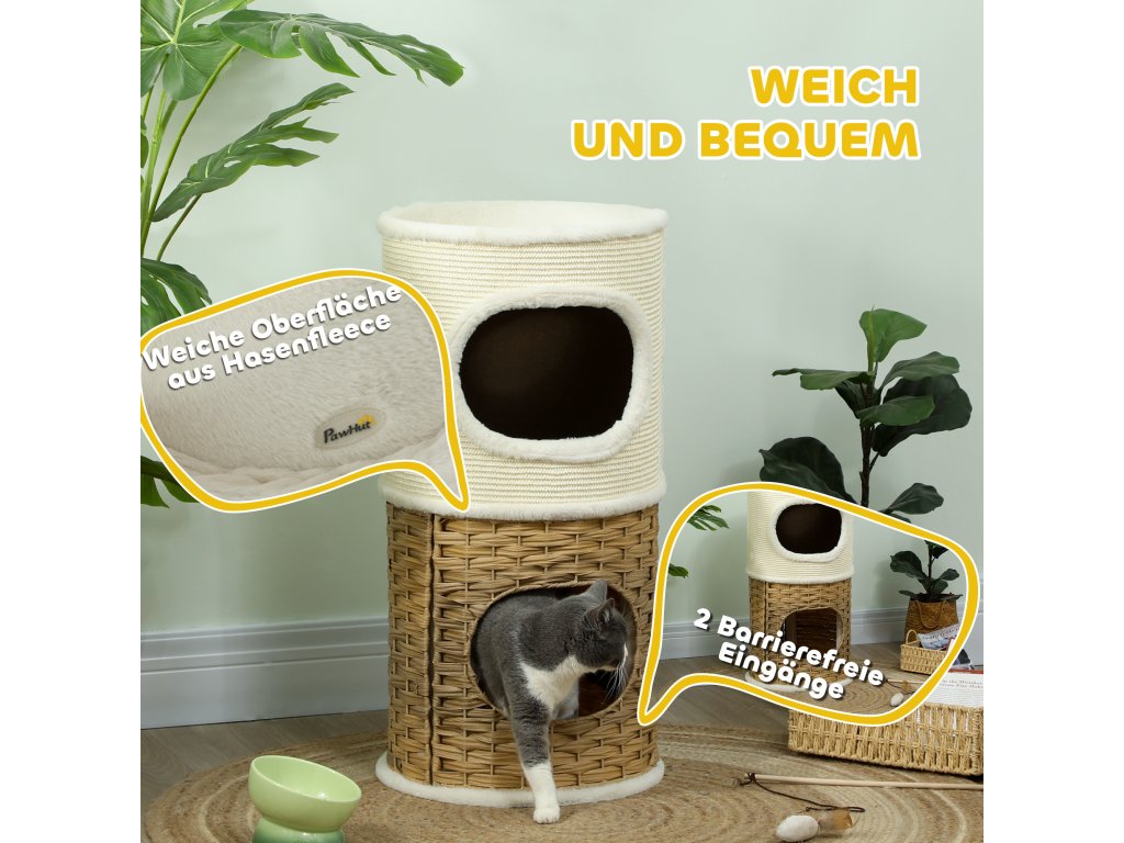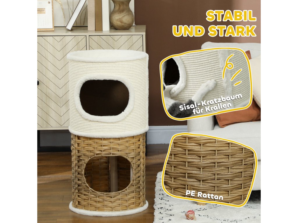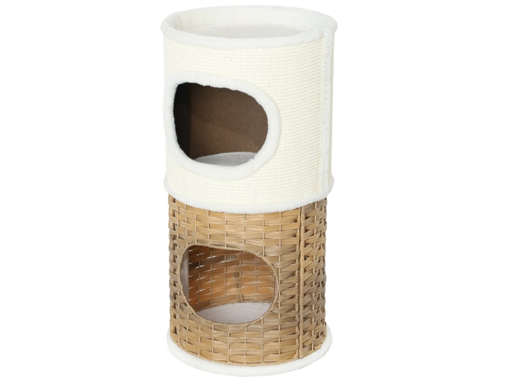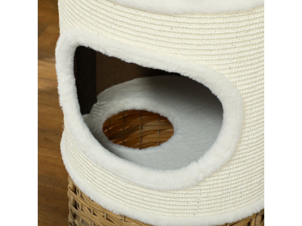 - Pelíšek pro kočky je vyrobena z dřevotřísky, králičího rouna a robustního PE ratanu a zajišťuje dlouhodobou odolnost. Horní patro je vybaveno sisalovým škrabadlem, které vaše kočka použije k broušení drápků.
