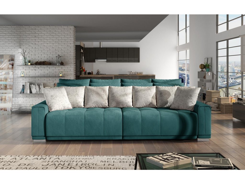 - zadní část je potažena do stejné látky jako celá pohovka, proto můžete pohovku umístit i do volného prostoru