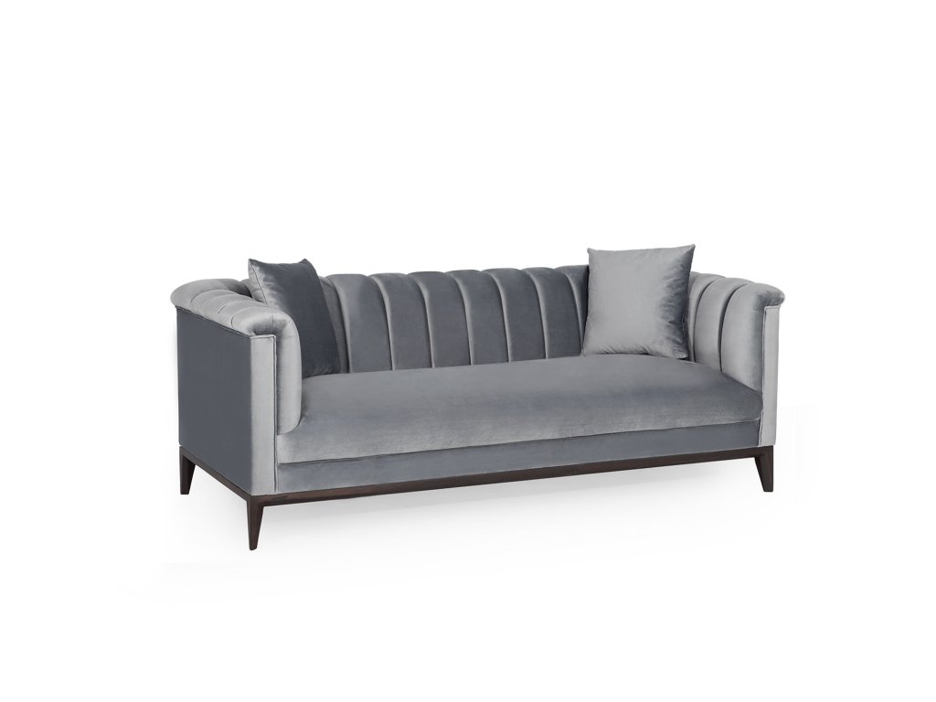 PERA je elegantní dvoumístná designová pohovka s mohutnými područkami a pohodlným šedým sametovým polstrováním.