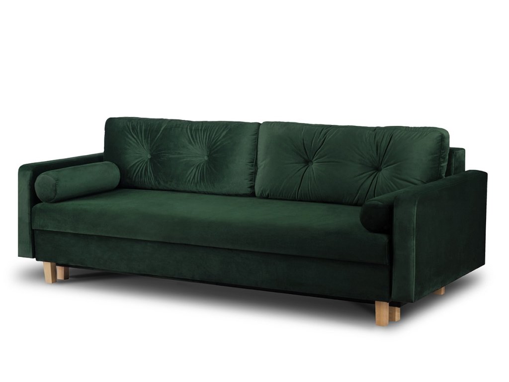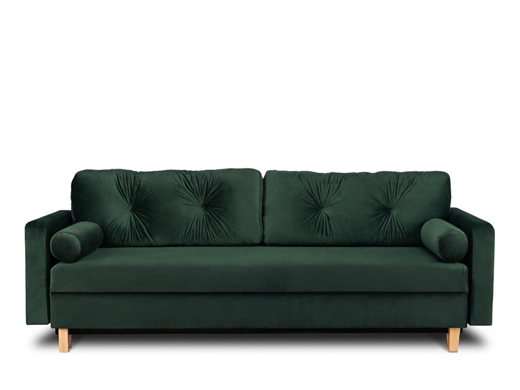 Stylová pohovka je jedním z nejdůležitějších prvků dobře vybaveného obývacího pokoje. Skandinávská pohovka z kolekce ERISO má funkci spánku - bude ideální pro hosty, kteří vás navštíví přes noc. Mechanismus rychlého, automatického rozložení - sklopením opěradla dopředu usnadňuje používání. Vnitřní úložný prostor poskytne potřebný prostor pro uložení peřin. Čalounění vyrobené z vysoce kvalitní tkané látky se vyznačuje trvanlivostí a odolností proti poškození. Dva polštáře na zádech a dva dekorativní polštáře zvyšují pohodlí při používání této moderní pohovky. Díky zipům skrytým v estetických polštářích lze snadno odstranit a rychle prát. Pohodlí zajišťuje středně tvrdé sedadlo vyrobené z pružinové lamely a polyuretanové pěny. Díky této moderní skandinávské pohovce se každý bude cítit uvolněně a pohodlně!