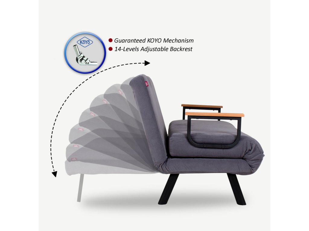 Její masivní kovové nohy a dřevěné područky, které po rozložení souží jako opěrné nohy lůžka, dotváří moderní vzhled.