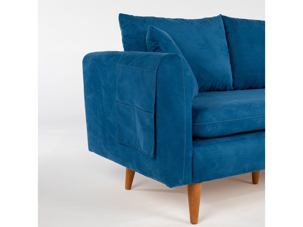 Konstrukce je dřevěná, stabilní; na boku pohovky je praktický organizér na drobnosti i ovladače.