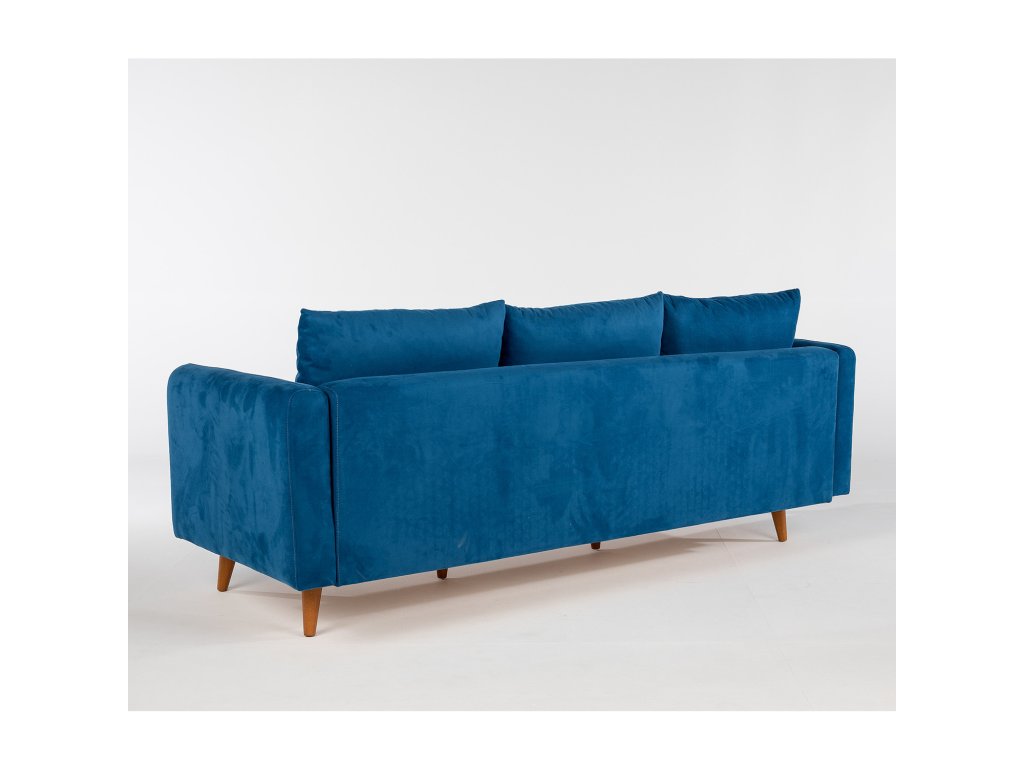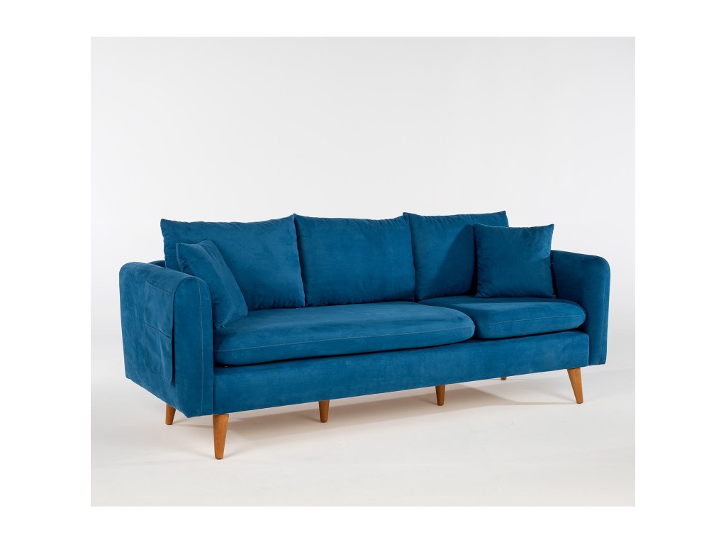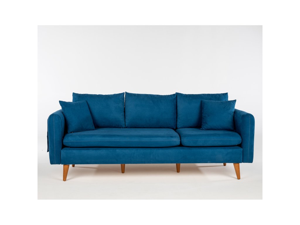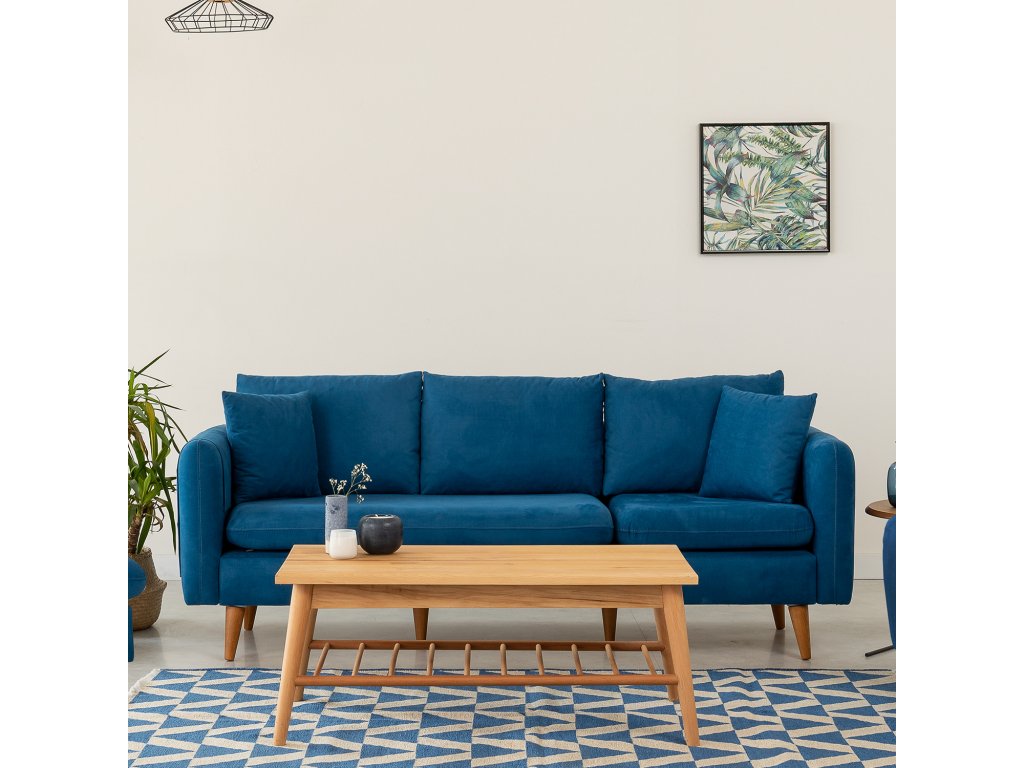 Trojmístná pohovka SOFIA v sedmi barevných variantách stojí na dřevěných nohách.