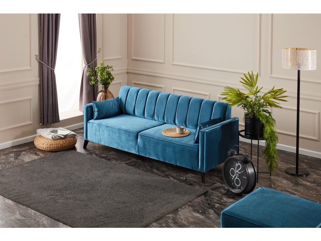 Představujeme vám tyrkysovou trojmístnou rozkládací pohovku OVA, vaši budoucí dokonalou oázu pohodlí a relaxace! Precizně vyrobená pohovka je skutečným mistrovským dílem, které v sobě spojuje styl, pohodlí a funkčnost. Tato variabilní rozkládací pohovka, vyrobená z bukového rámu a čalouněná 100% polyuretanovo-akrylovou látkou tyrkysové barvy je navržena tak, aby odolala i zkoušce času.
