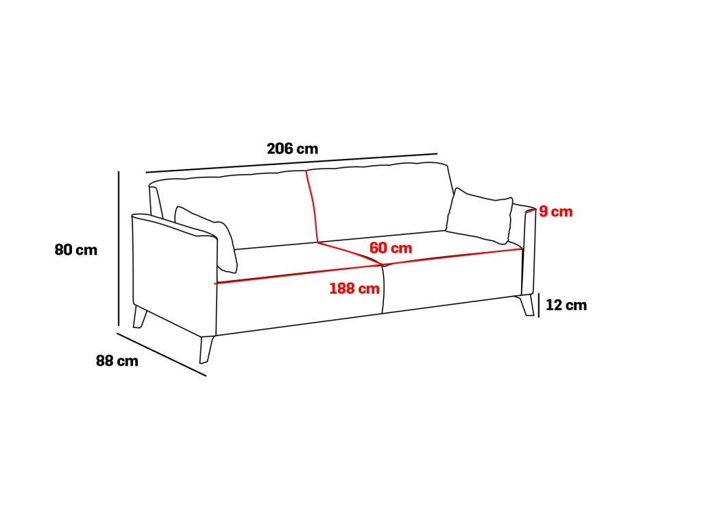 Při šířce 206 cm, výška 80 cm a hloubka 88 cm nabízí dostatek prostoru pro relaxaci a odpočinek vás i vašich blízkých. Výška sedáku 40 cm a hloubka sedu 60 cm zajišťuje optimální pohodlí, zatímco sklopné opěrky zad zvládnou tuto sedací soupravu snadno přeměnit na útulné lůžko. Plastové 12 cm vysoké nohy dodávají celé pohovce stabilitu a podporují i moderní design. Trojmístná tyrkysová rozkládací pohovka OVA s krémovým čalounění poskytuje nejen maximální pohodlí, ale také všestranný prostor pro relax a odpočinek.