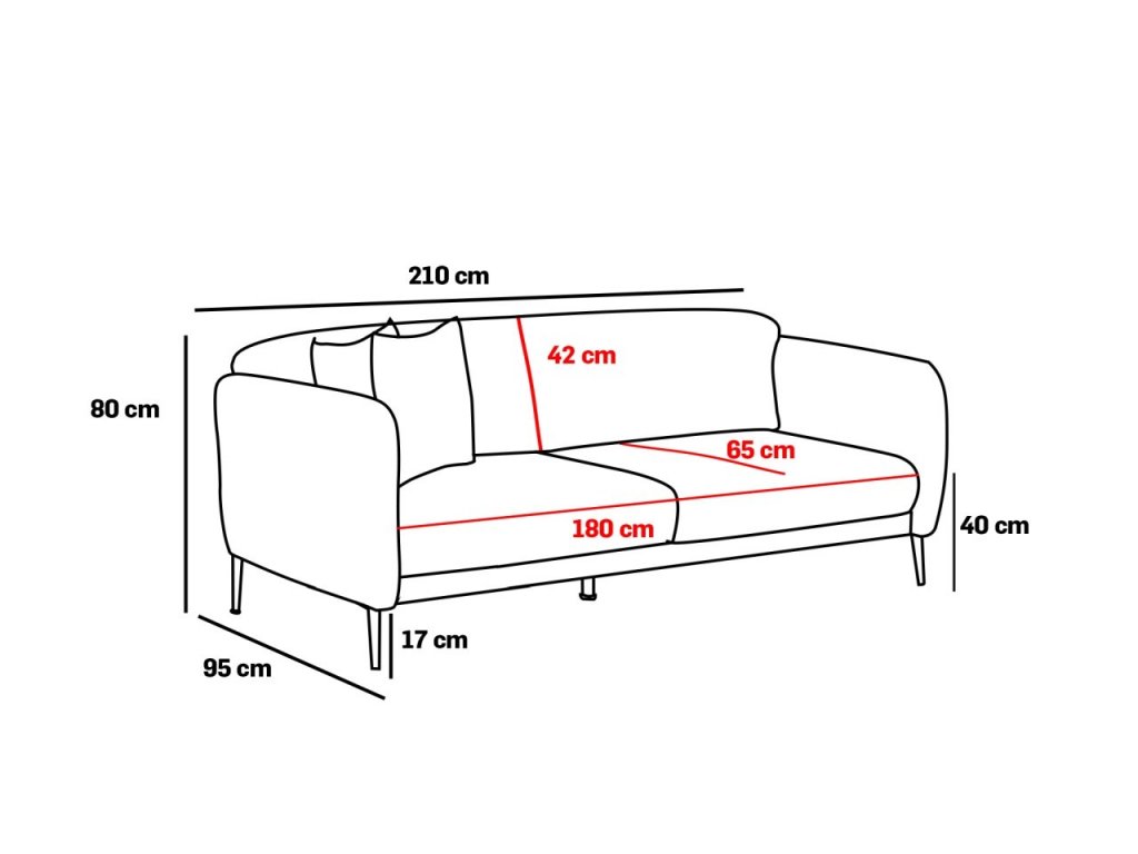 Rozměry: Šířka: 210 cm Výška: 80 cm Hloubka: 95 cm, Výška sedáku: 40 cm Hloubka sedáku: 65 cm, Výška nohou: 17 cm