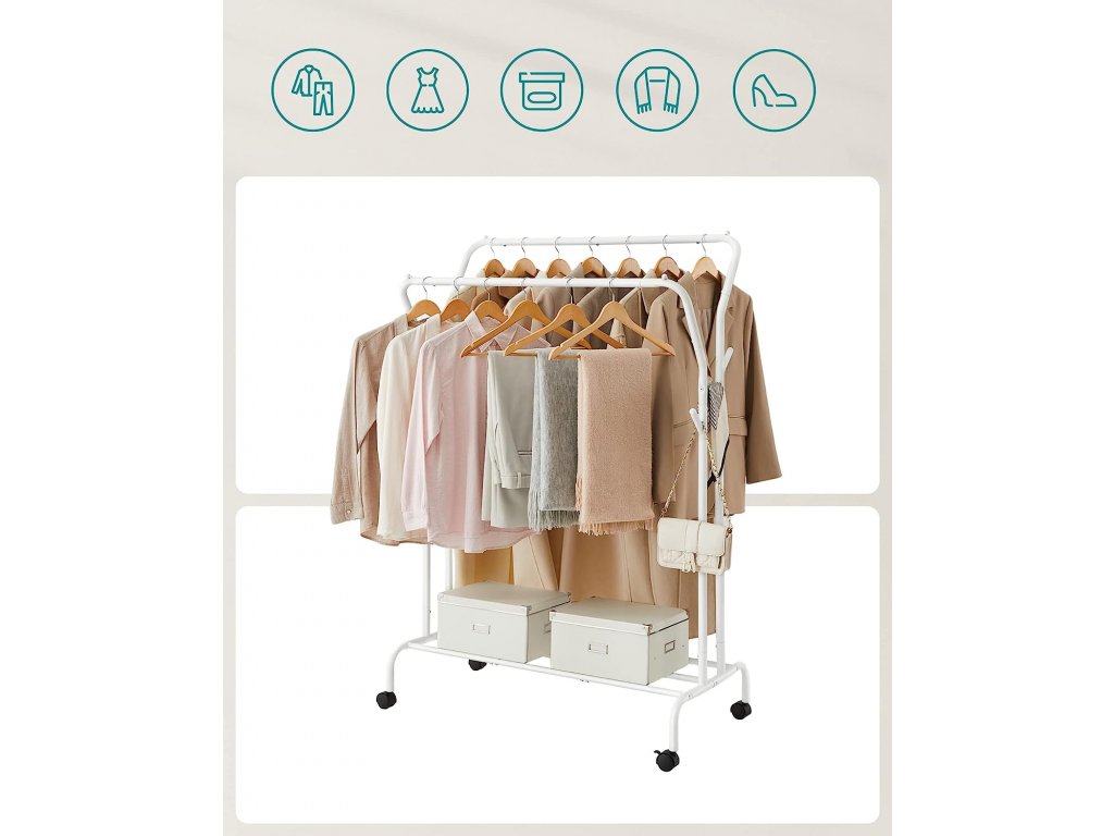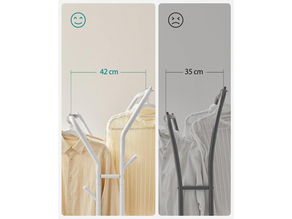 Věšák má jednu tyč výše, což umožňuje zavěšení různě dlouhého oblečení. Na obou stranách jsou umístěny háčky pro tašky a klobouky. Pod tyčemi je police, která poskytuje další úložný prostor pro krabice, boty a další věci.