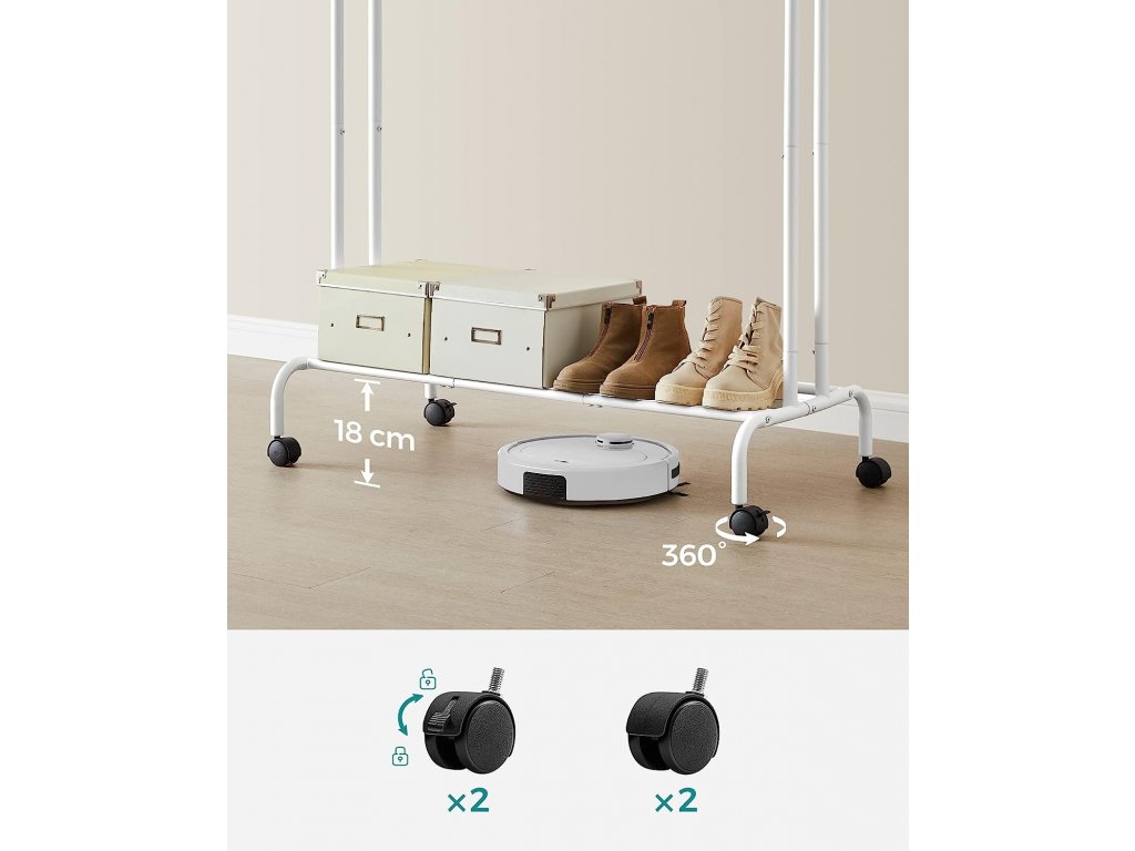 Věšák je vybaven 4 kolečky, která umožňují snadné přemisťování po prostoru a díky 2 brzdám na kolečkách ho snadno zajistíte na místě.