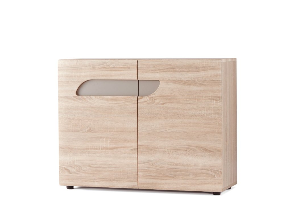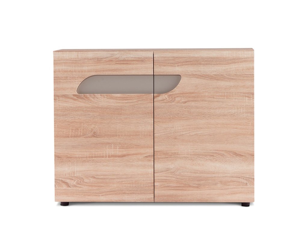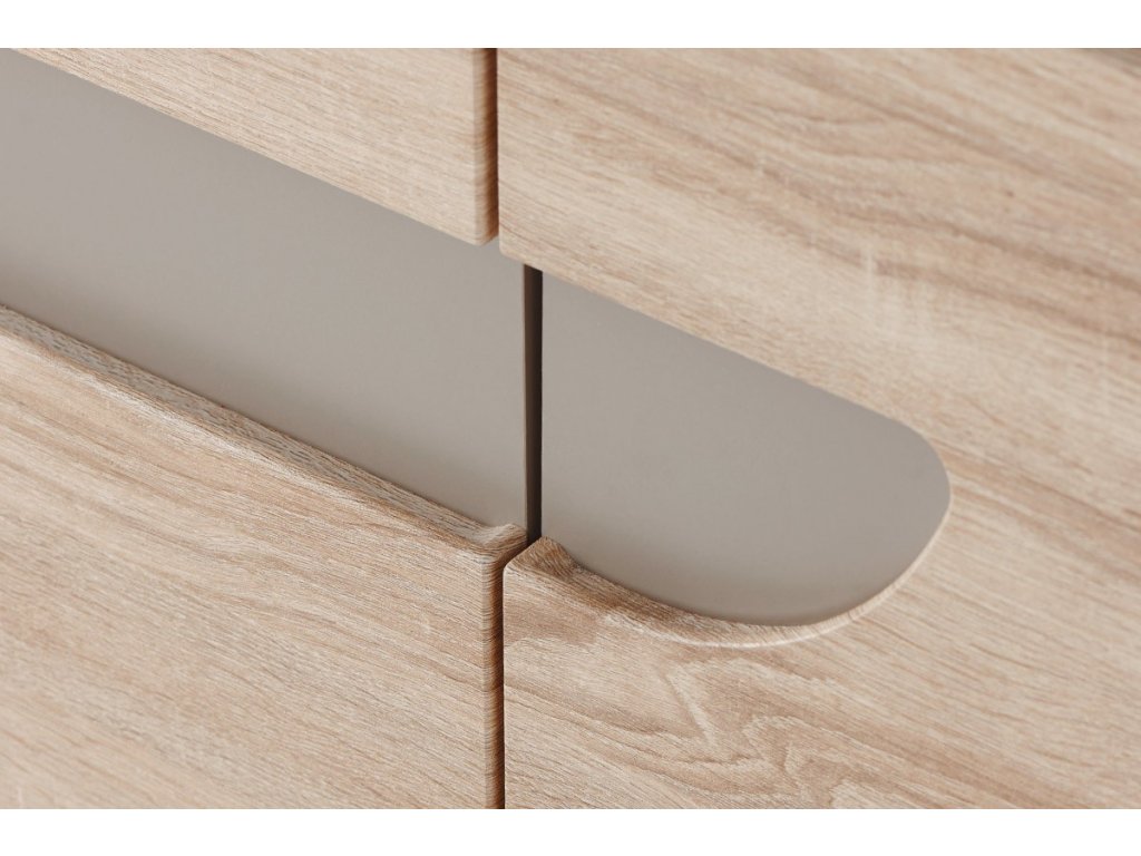 Moderní design, laminát podobný dřevu a originální frézované výřezy ve dveřích zdůrazňují moderní a módní charakter této komody.