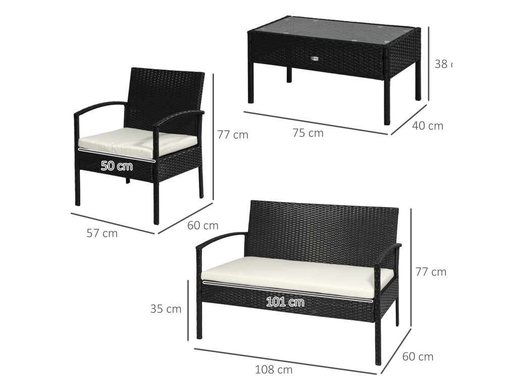 Náš vysoce kvalitní polyratanový salonek Outsunny vám nabízí ideální místo pro odpočinek a posezení s rodinou a přáteli. Tato souprava balkonového nábytku se skládá z 1 konferenčního stolku, 1 dvoulůžkové pohovky a 2 jednolůžkových pohovek a nabízí pohodlné sezení až pro 4 osoby. Tento zahradní nábytek attan je vyroben z práškově lakovaného kovu a ručně tkaného polyratanu, je odolný vůči povětrnostním vlivům a trvanlivý, takže je praktickým doplňkem.