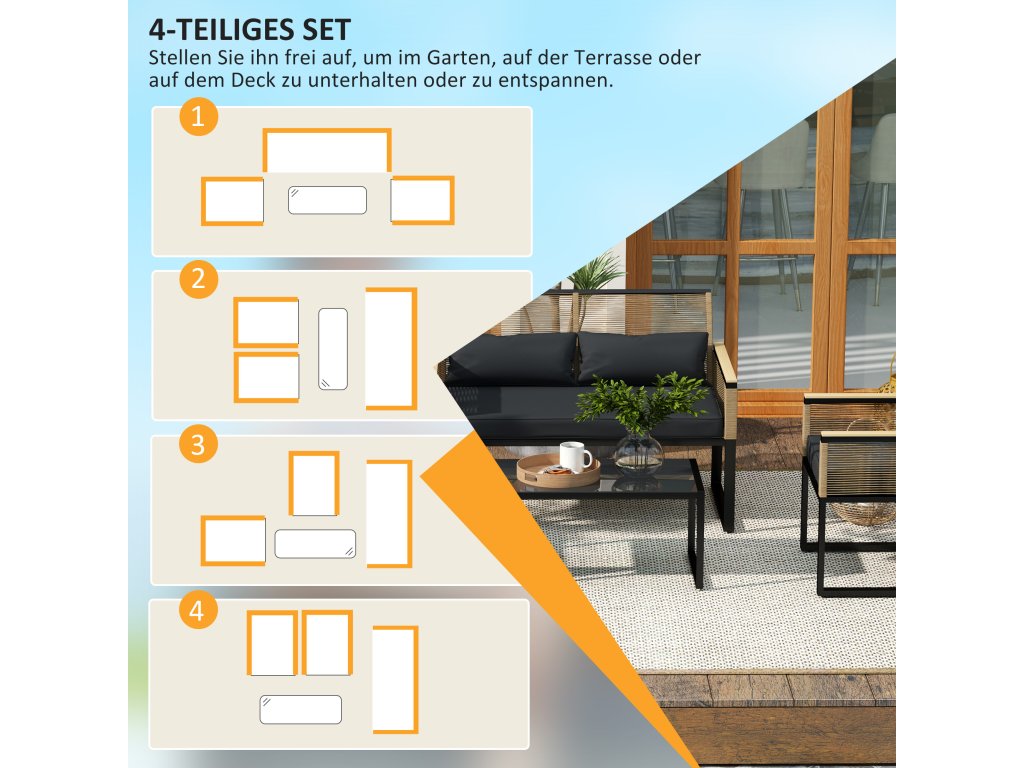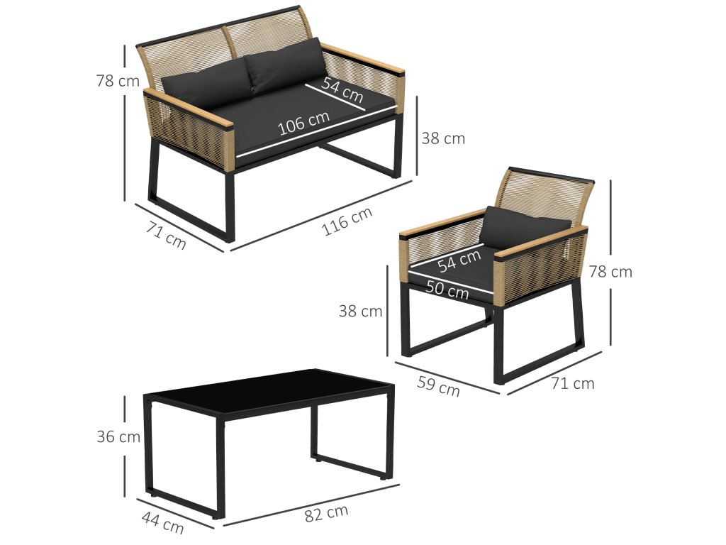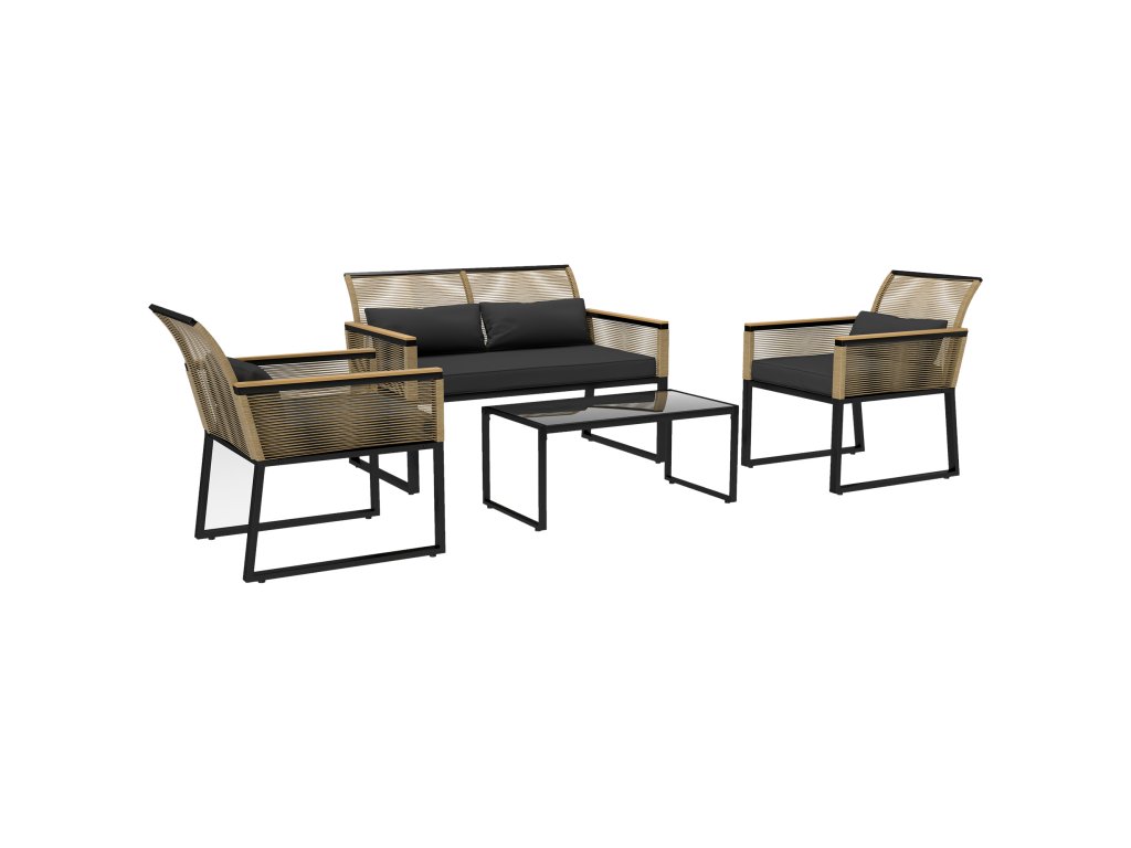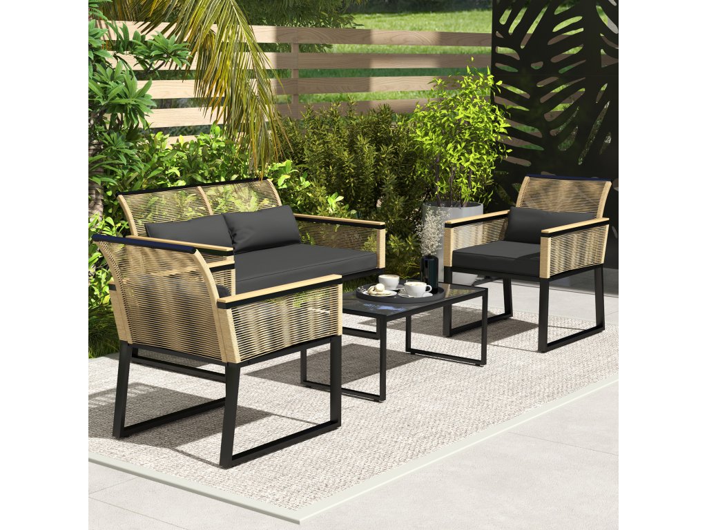 - Čtyřdílná sada zahradního nábytku: obsahuje sedací soupravu, dvě křesla a konferenční stolek.