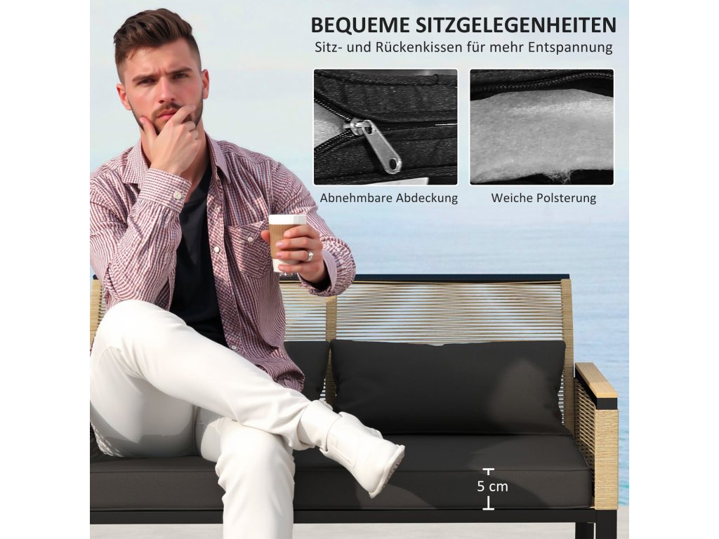 Proměňte svůj venkovní prostor pomocí této elegantní sady zahradního nábytku Outsunny z ratanu. Tato zahradní souprava obsahuje sedací soupravu, dvě křesla a odpovídající konferenční stolek. Ocelové rámy poskytují pevný základ a jsou vypleteny elegantním plastovým ratanem. Tato sada balkonového nábytku nabízí polštáře s odnímatelnými potahy pro větší pohodlí. Stůl s deskou z tvrzeného skla se hladce a stylově začlení do vaší zimní zahradní soupravy.