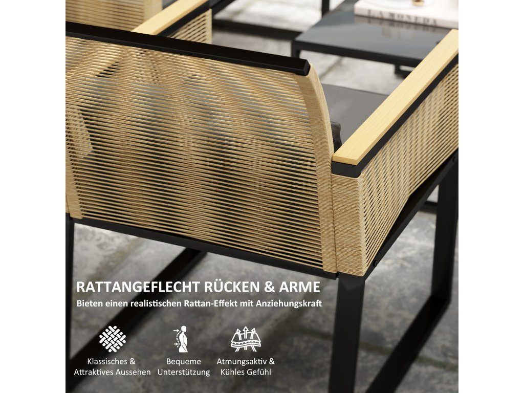 - Práškově lakovaný ocelový rám zahradní soupravy pro zajištění stability, zabalený do stylového plastového ratanu odolného proti UV záření