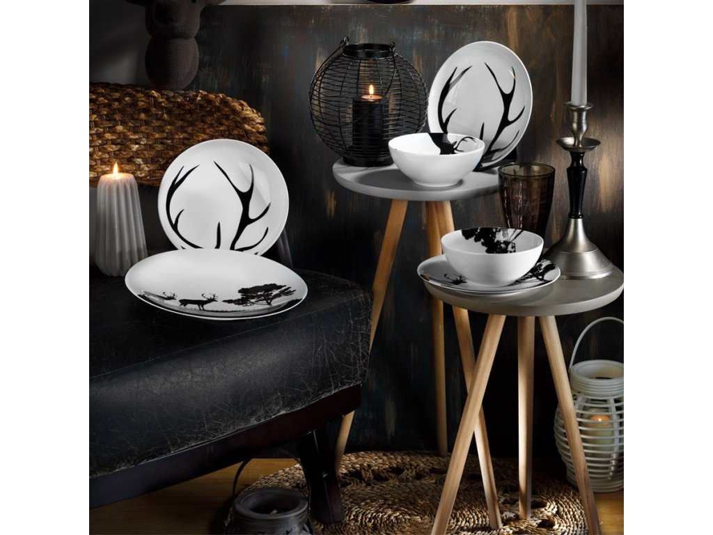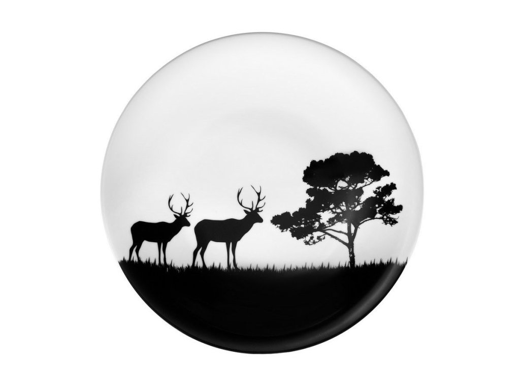 Souprava DEER Vám nabízí tři druhy talířů a hluboké misky v bílé barvě s dekorativní černou malbou jelenů a stromů.