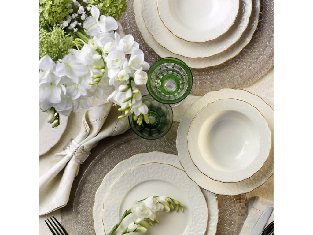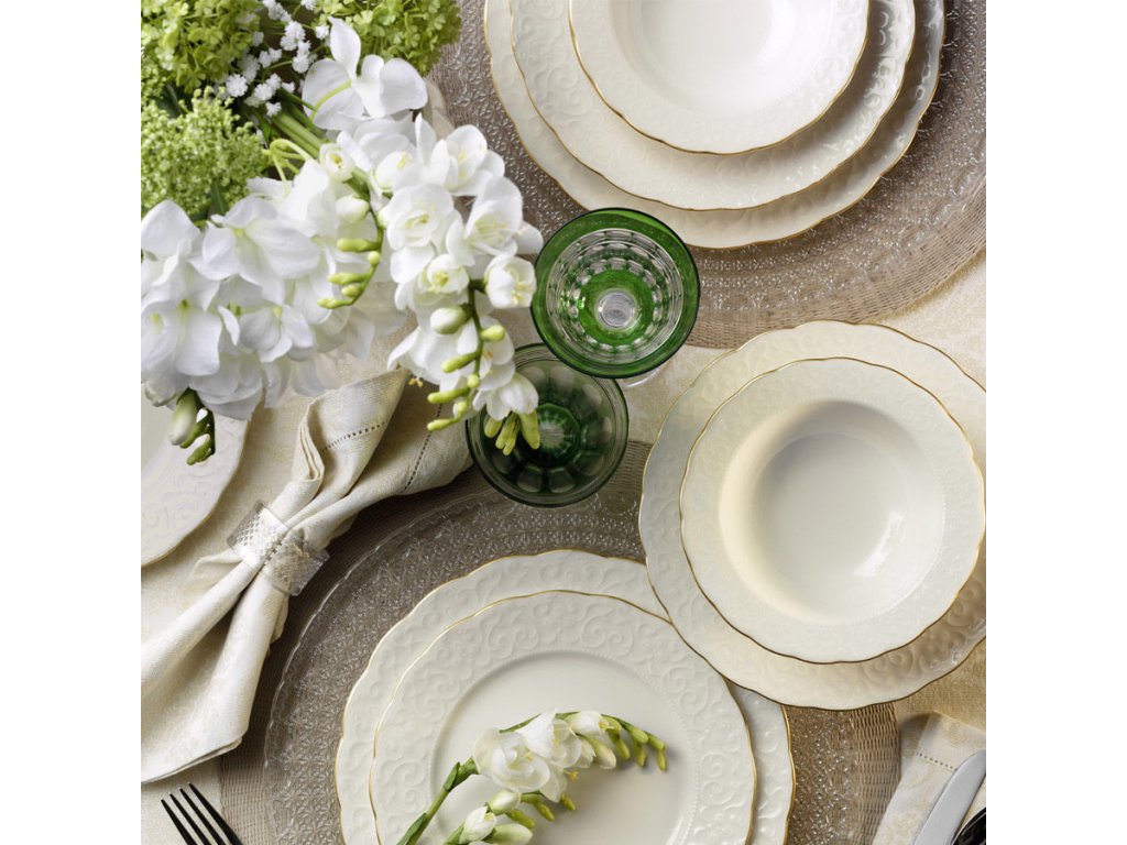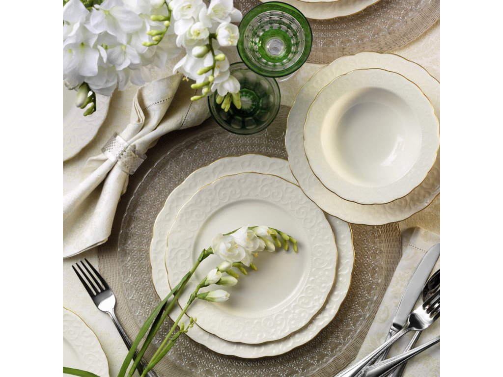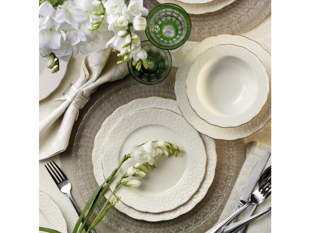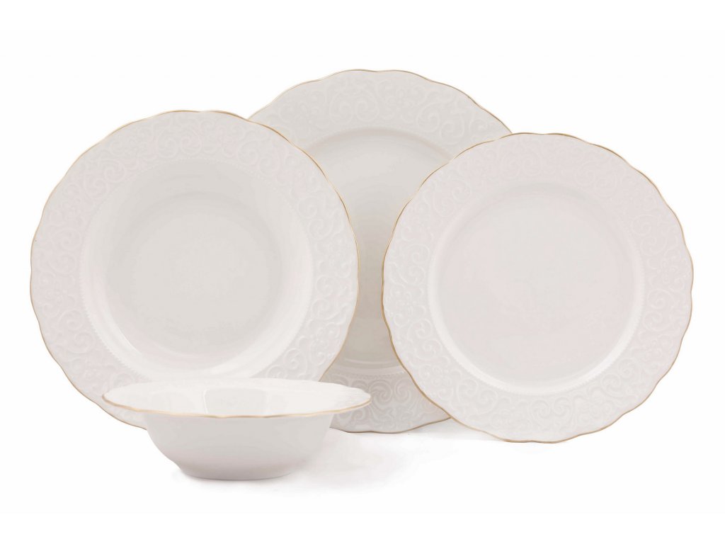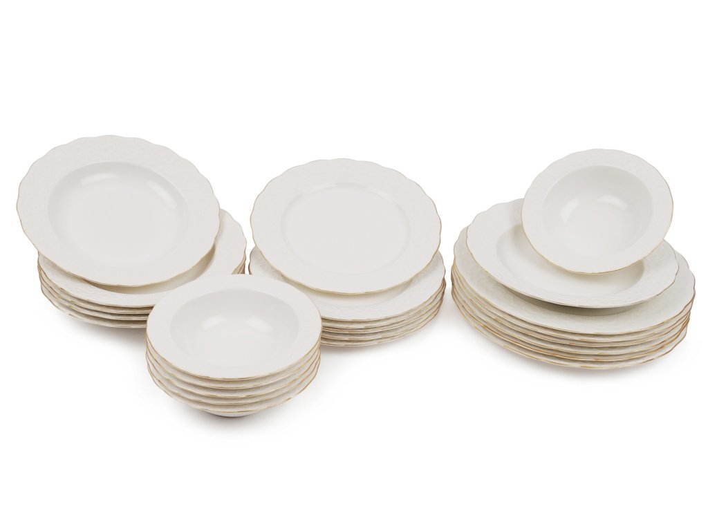 Porcelánová jídelní souprava RUSTIK GOLD se skládá z 24 kusů bílého porcelánu vhodného pro velké rodiny, nebo jako servis pro oslavy.