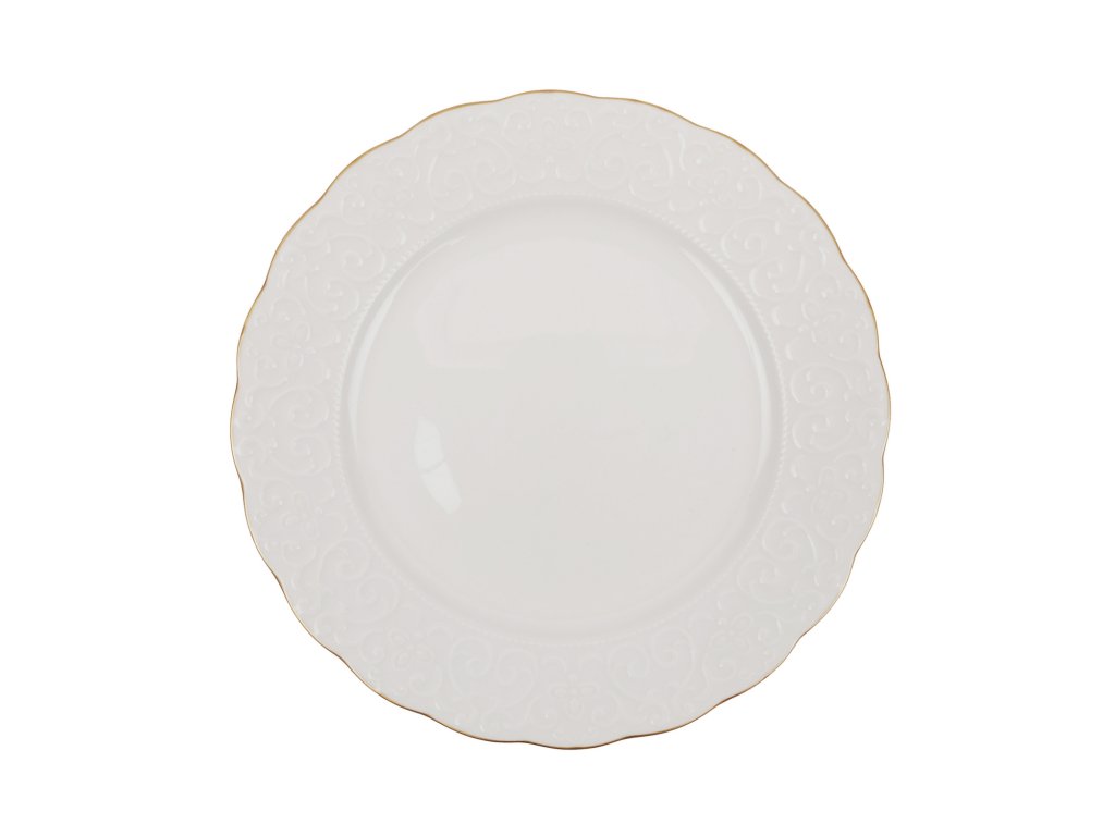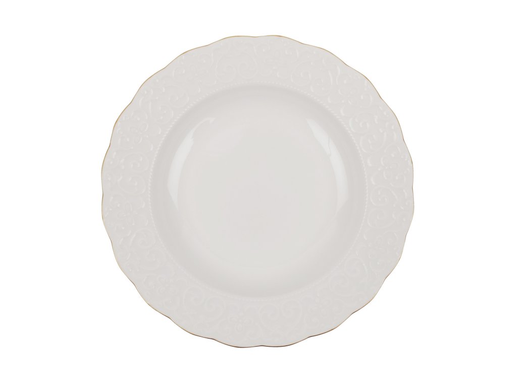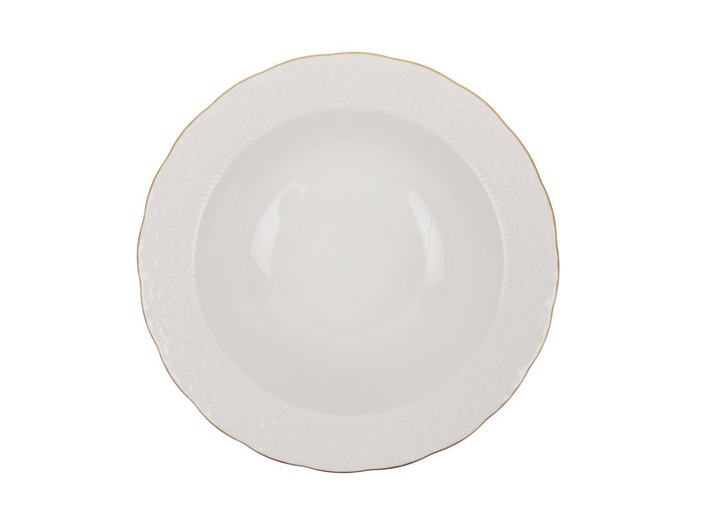 Souprava RUSTIK GOLD Vám nabízí tři druhy talířů a hluboké misky v bílé barvě s dekorativní linkou po obvodu každého kusu.