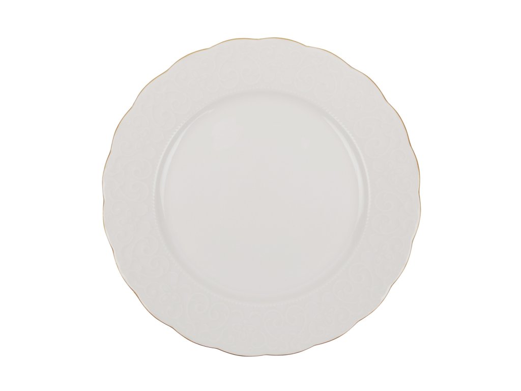 Je vyroben z čistého porcelánu bílé barvy se zlatou linkou.