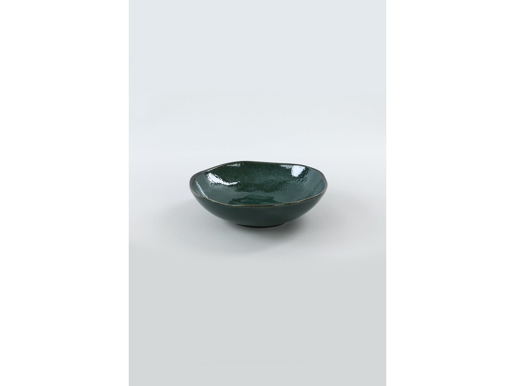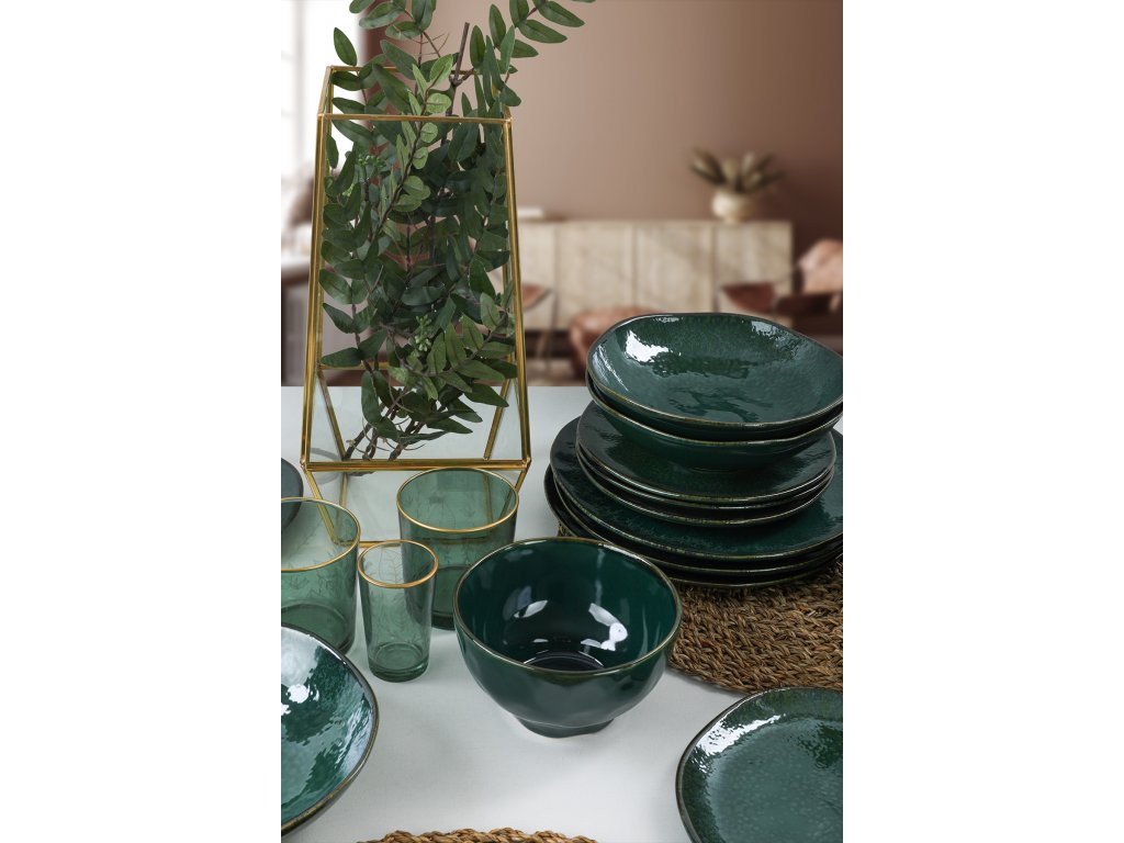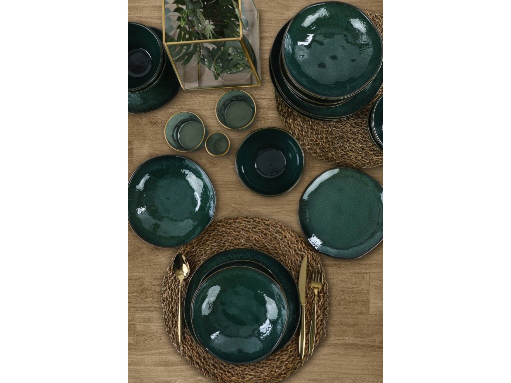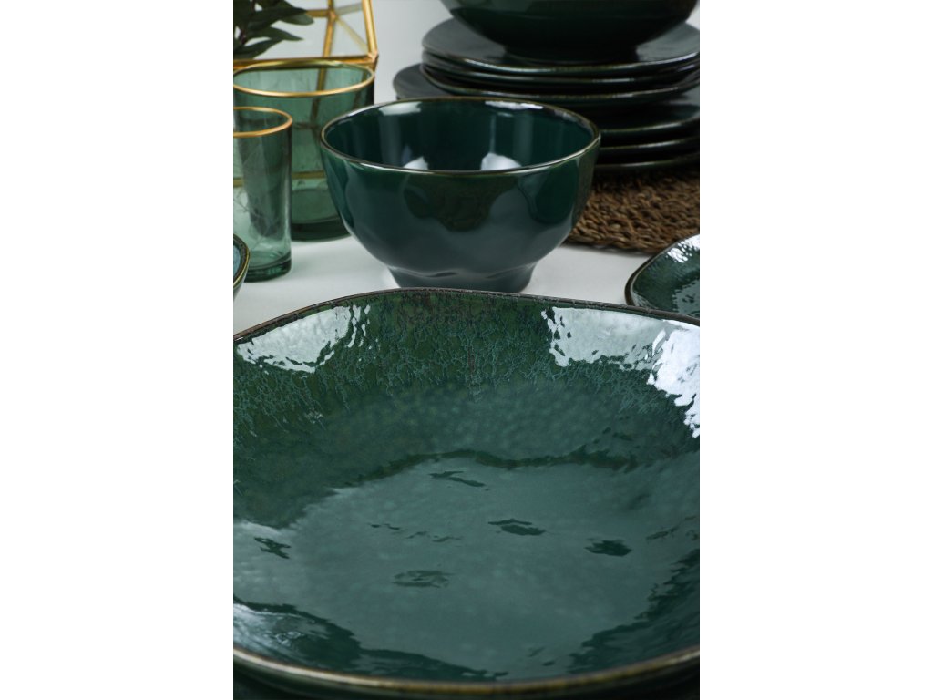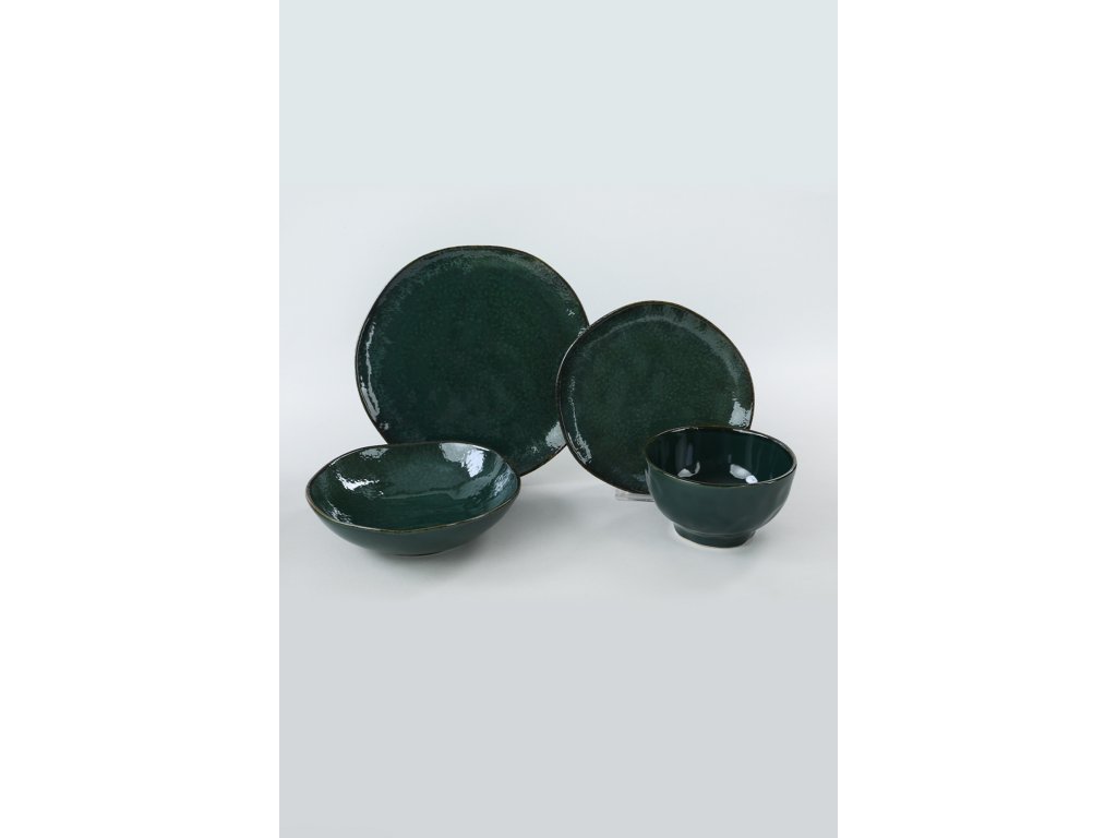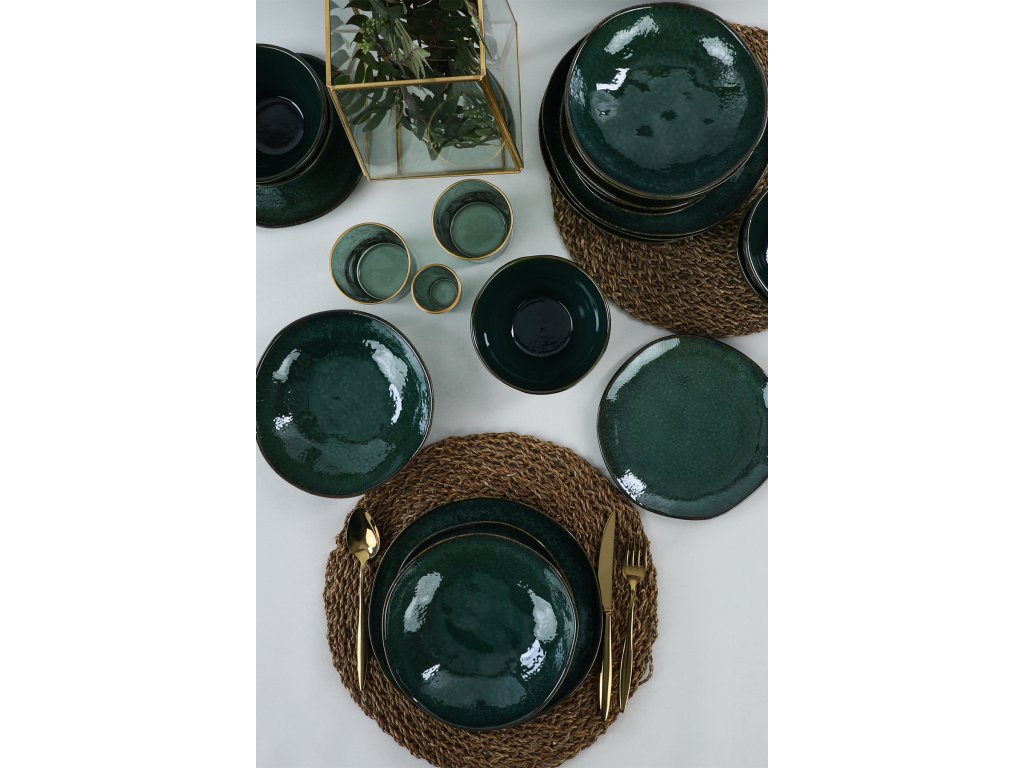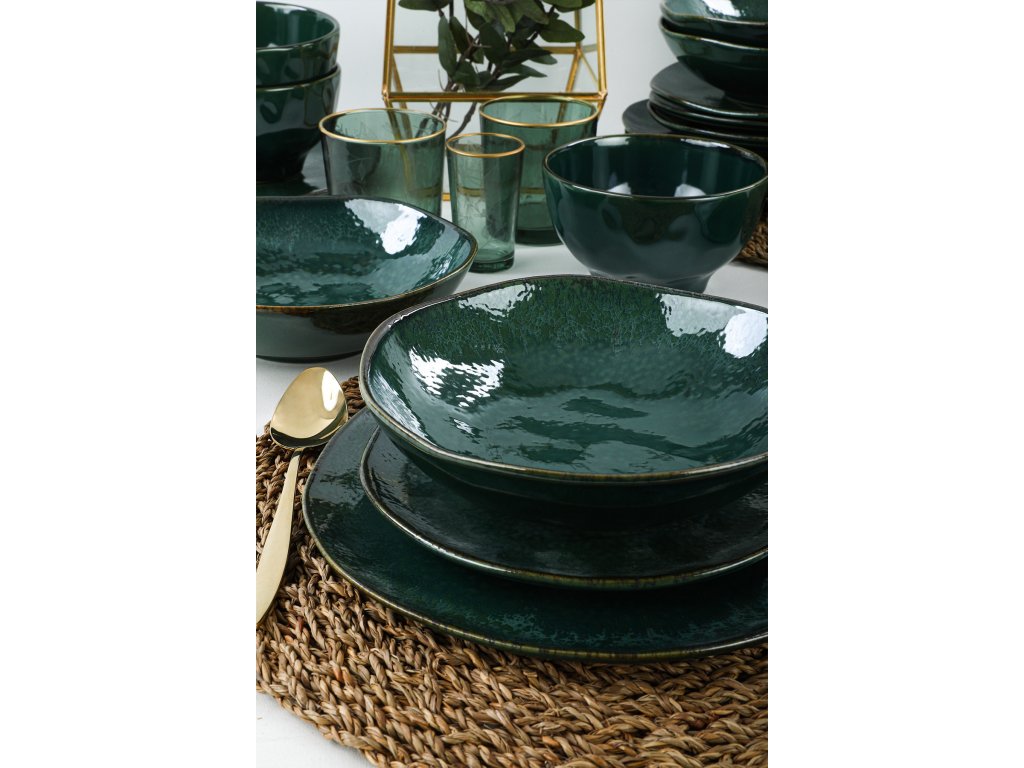 Keramická jídelní souprava ZUMR je složená ze čtveřic mělkých a hlubokých talířů a misek, které mají tmavě zelenou barvu umocněnou jemným hnědým lemem po obvodu každého kousku.