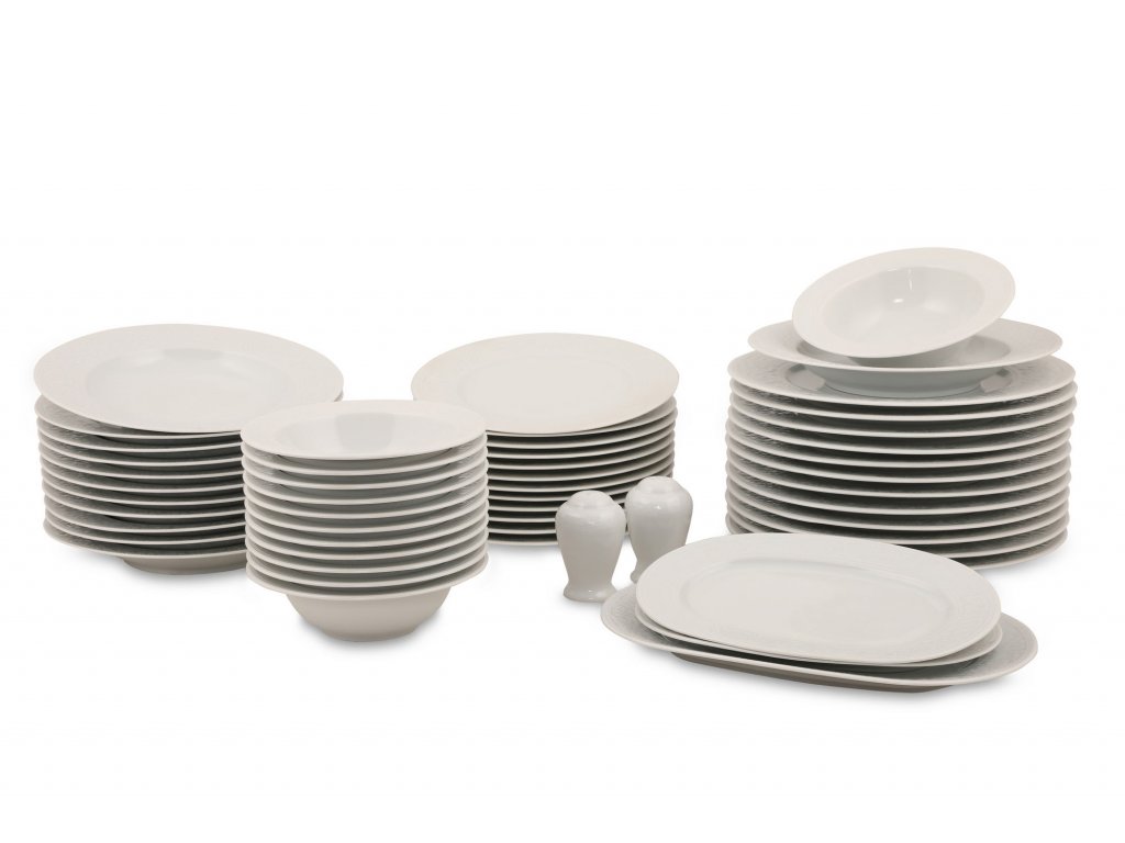 Porcelánová jídelní souprava RUSTIK se skládá z 53 kusů bílého porcelánu vhodného pro velké rodiny, nebo jako servis pro oslavy.