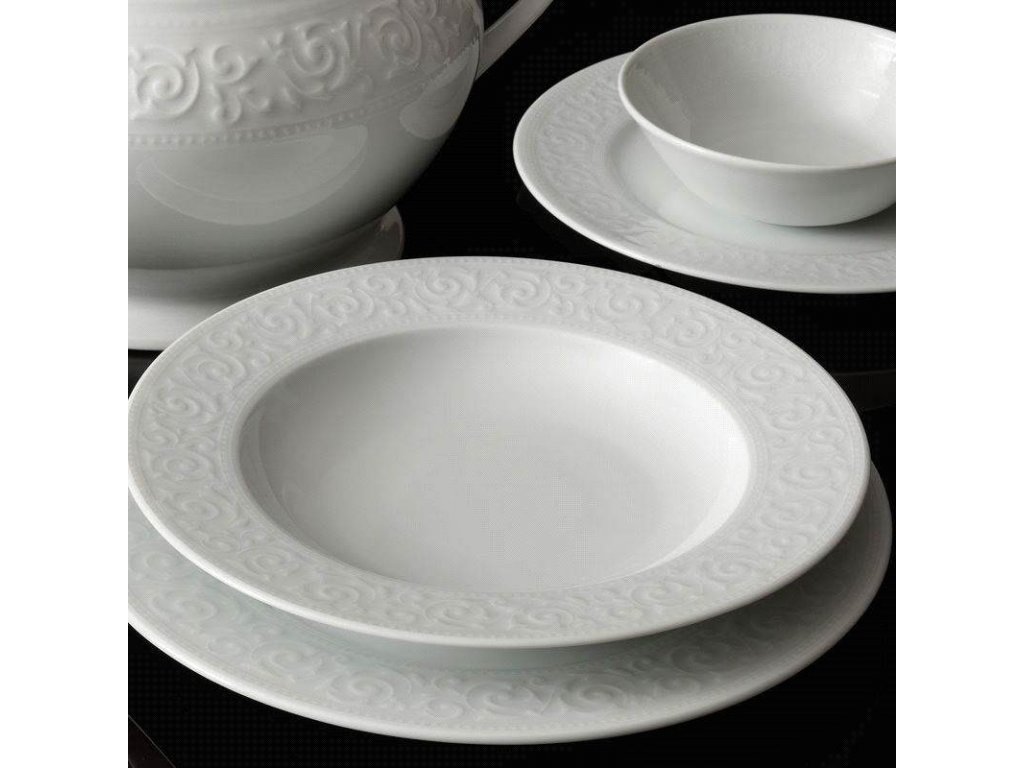 Je vyroben z čistého porcelánu bílé barvy s plastickým dekorativním lemem.