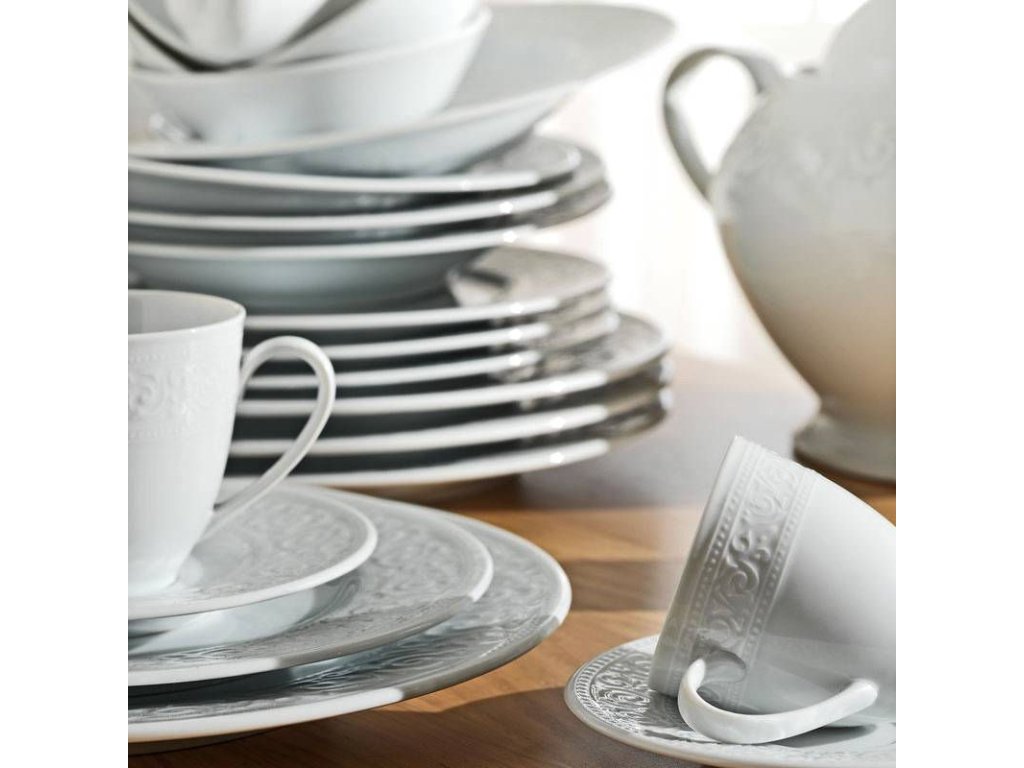 Souprava RUSTIK Vám nabízí pět druhů talířů, hluboké misky, polévkovou mísu, šálky s podšálky a slánku s pepřenkou v bílé barvě s dekorativním plastickým lemem.