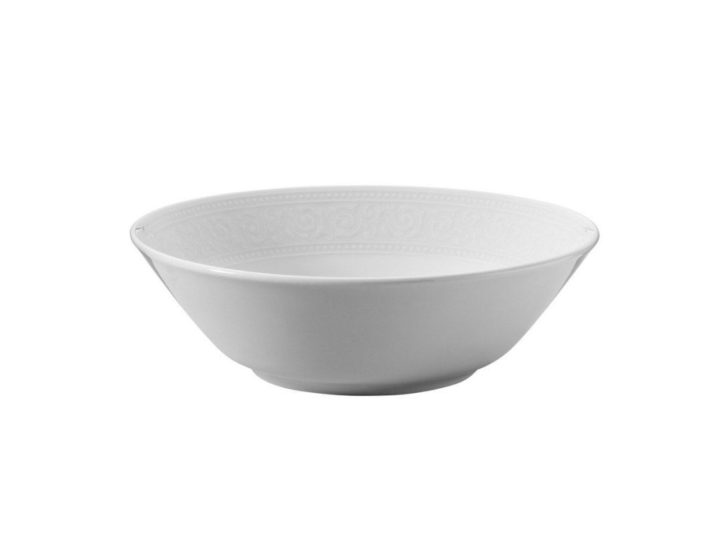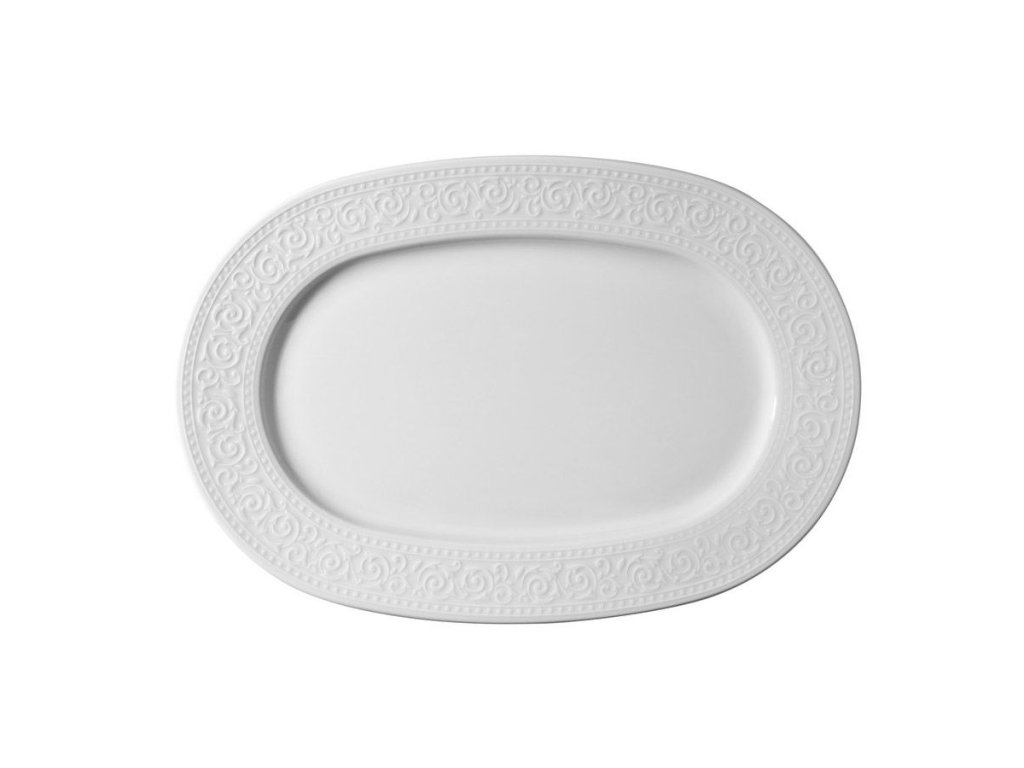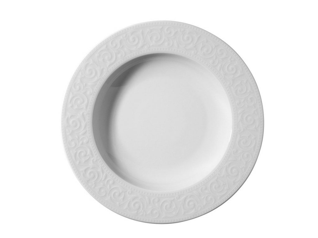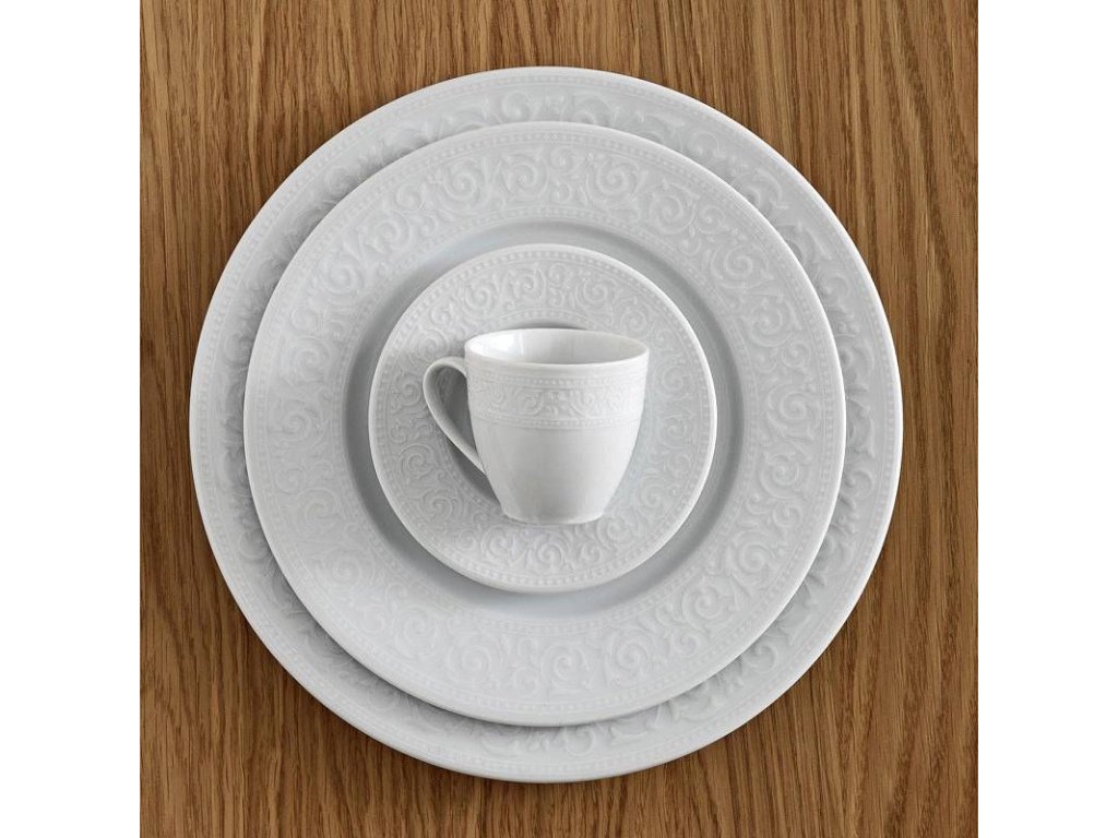 Je vyrobena z bílého porcelánu s dekorativním plastickým lemem.