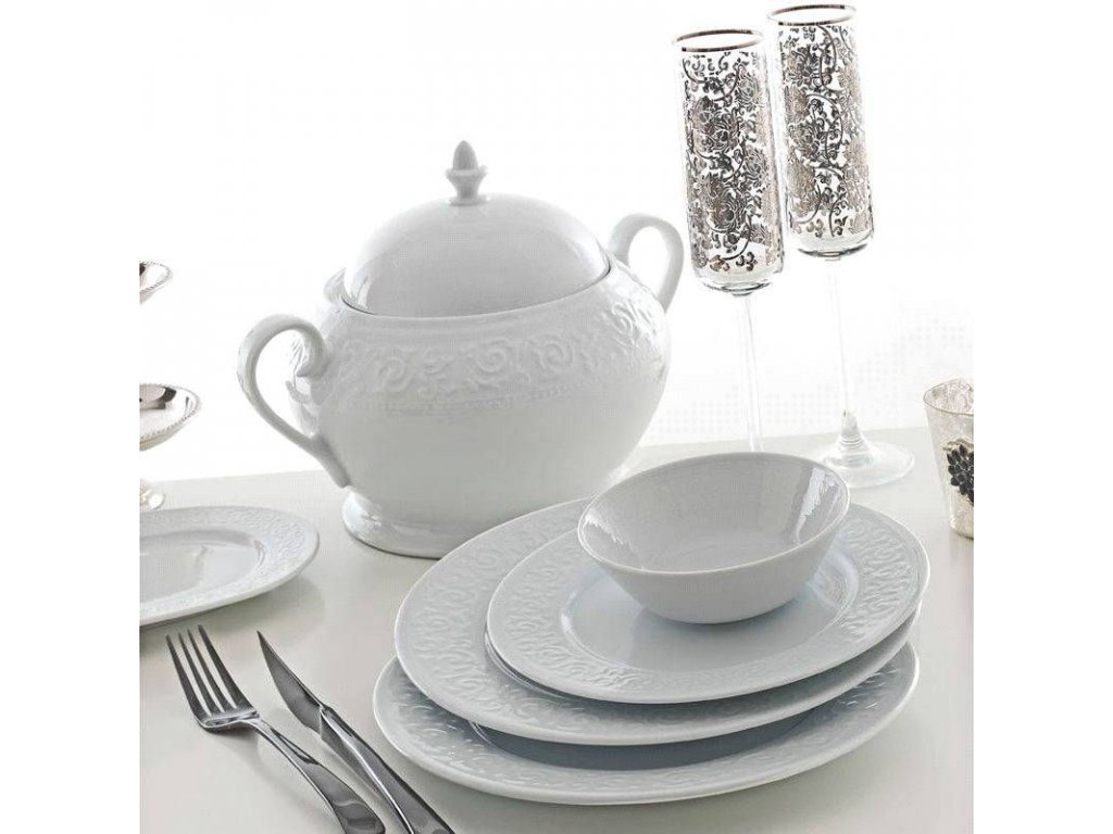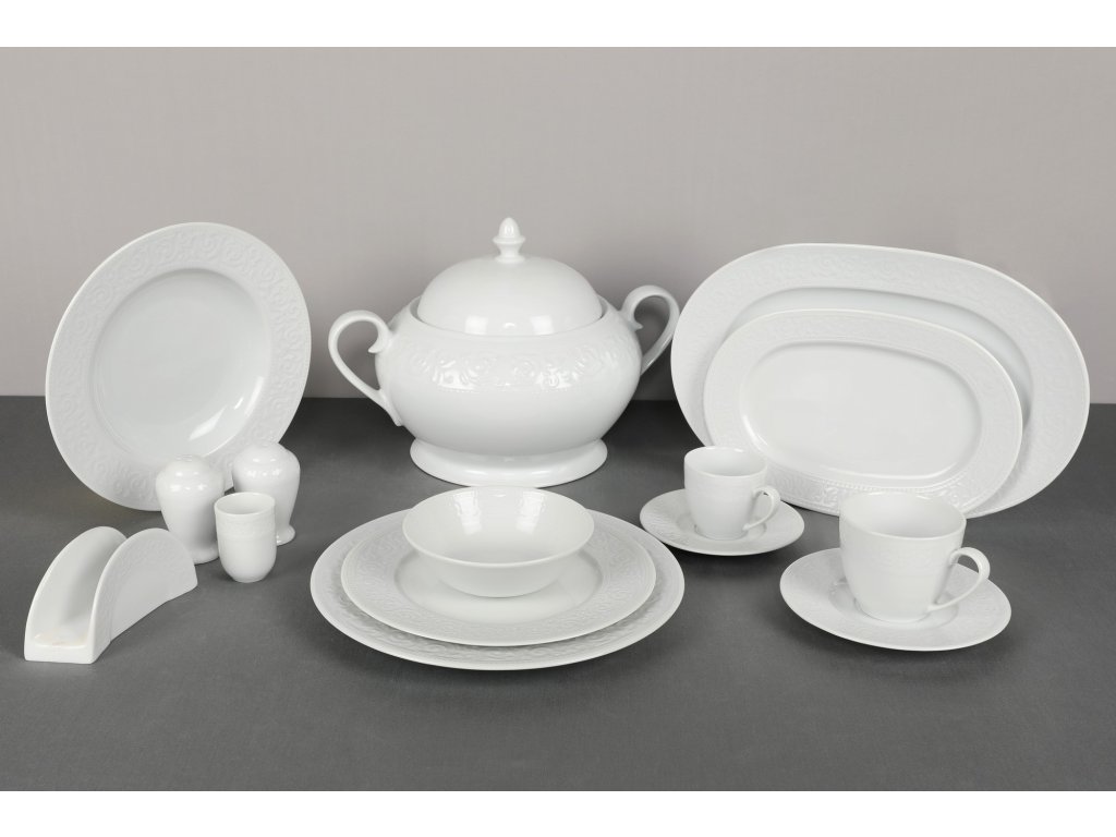 Porcelánová jídelní souprava RUSTIK se skládá z 83 kusů bílého porcelánu vhodného pro velké rodiny, nebo jako super obsáhlý servis pro oslavy.