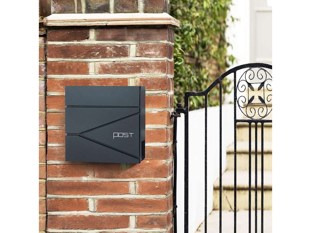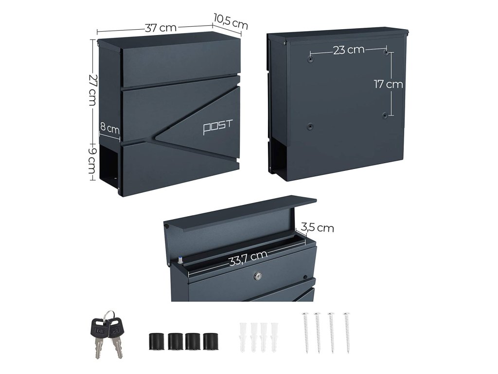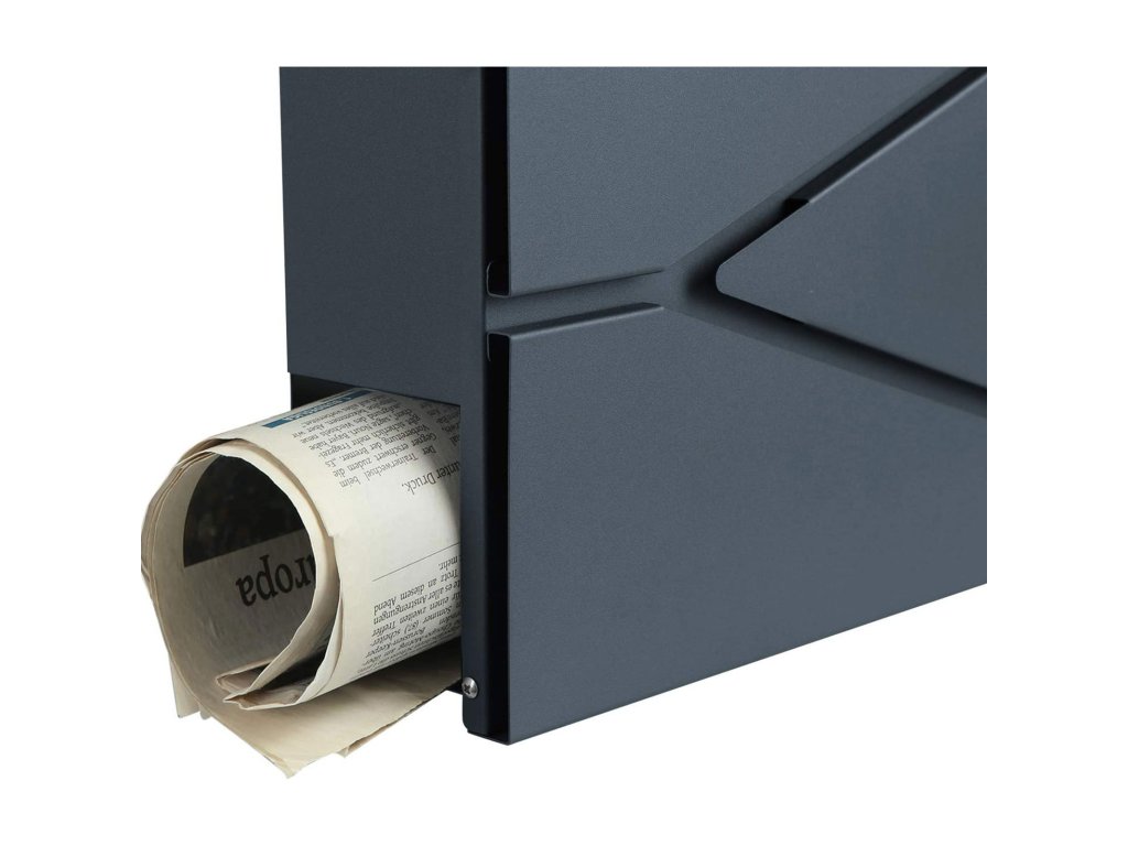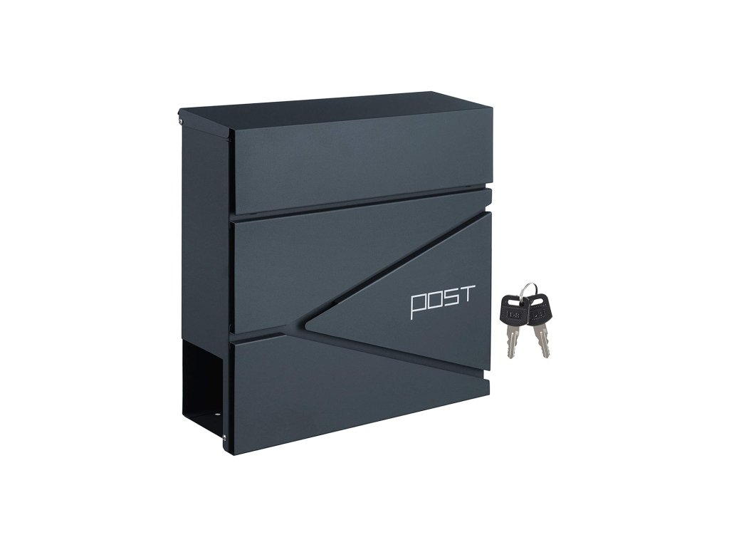 Geometrické prvky, čisté linie, práškově lakovaná ocel a šedé uhlí z ní dělají moderní a vysoce kvalitní poštovní schránku.