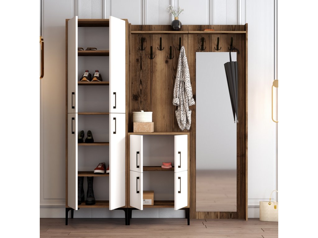 V dekoru ořech vyrobené tělo předsíňové stěny BERLIN je sestaveno ze dvou uzavíratelných botníků s bílými dvířky a je doplněno o velké zrcadlo a desky s háčky a malými poličkami.