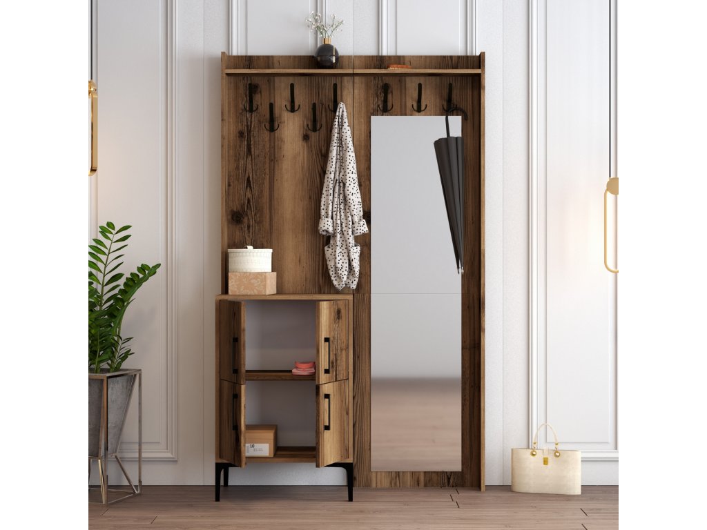 Doménou v dekoru ořech vyrobené předsíňové stěny BERLIN je velké zrcadlo usazené na desce s háčky doplněno o druhou kratší desku s uzavíratelným botníkem.