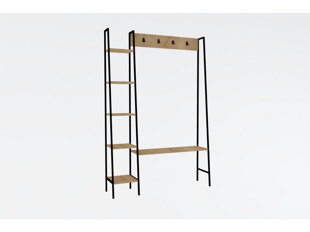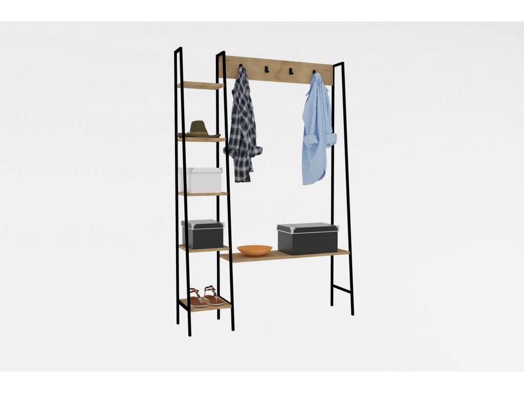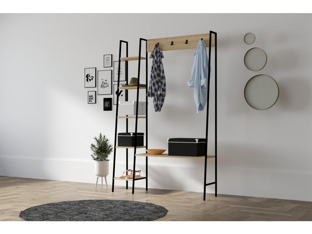 Předsíňová stěna MARKEN nabízí v dekoru dub sapphire vyrobenou lištu se čtyřmi háčky, pět menších a jednu delší odkládací desku, jenž jsou ukotvené v černé kovové konstrukci.