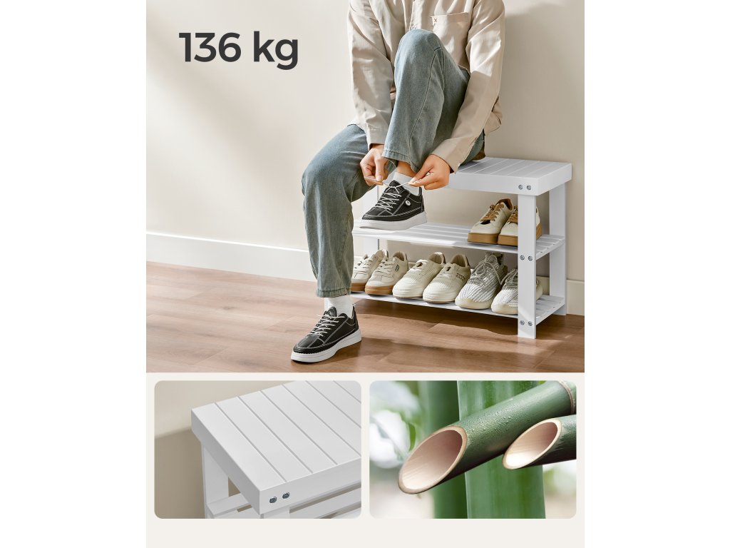 Lavička je vyrobena z přírodního bambusu a je navržena tak, aby měla dlouhou životnost. Může se pochlubit nosností až 136 kg a do každého patra se pohodlně vejdou 3 páry bot.
