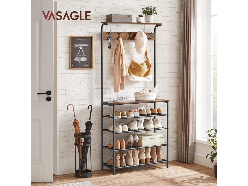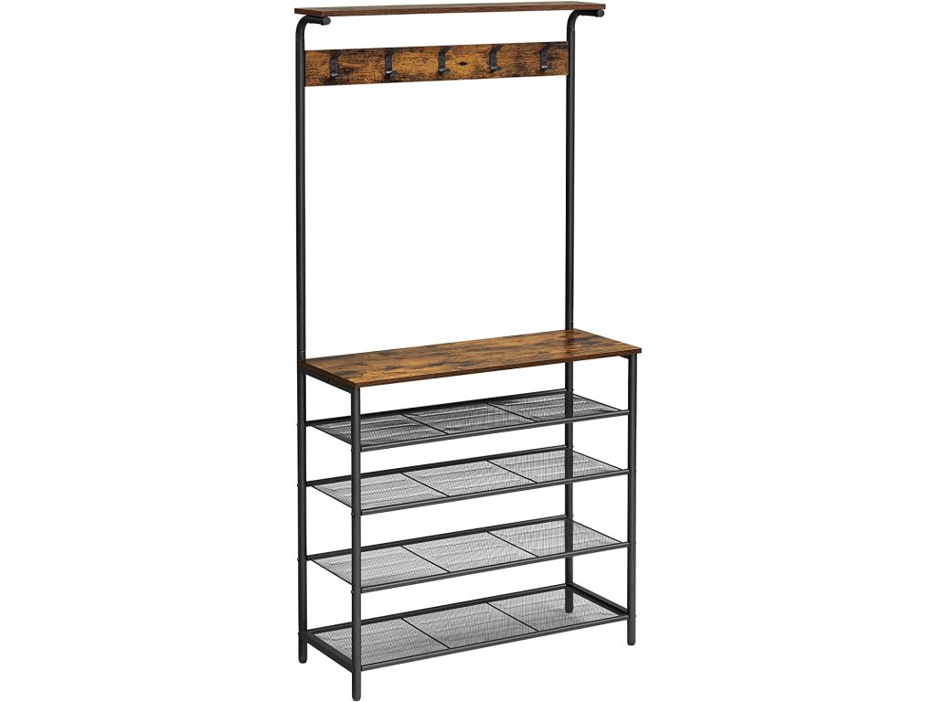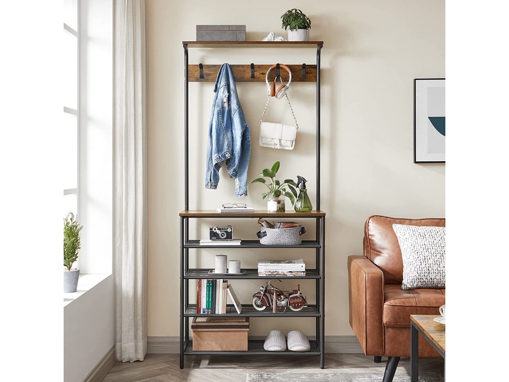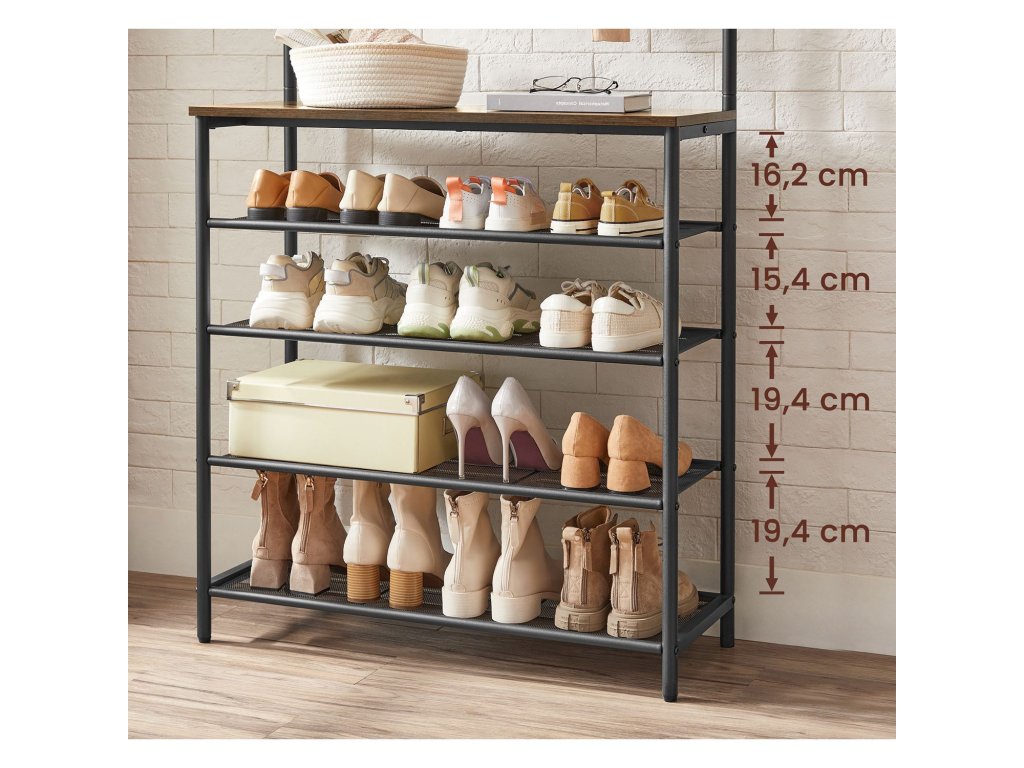 Praktický industriální čtyř-policový botník s věšákem na kabáty, s horní policí na čepice a s odkládací policí na tašky.