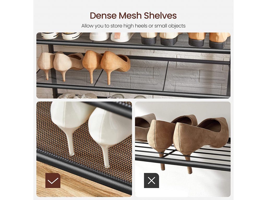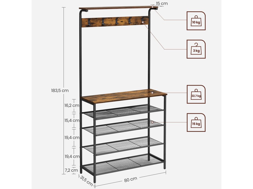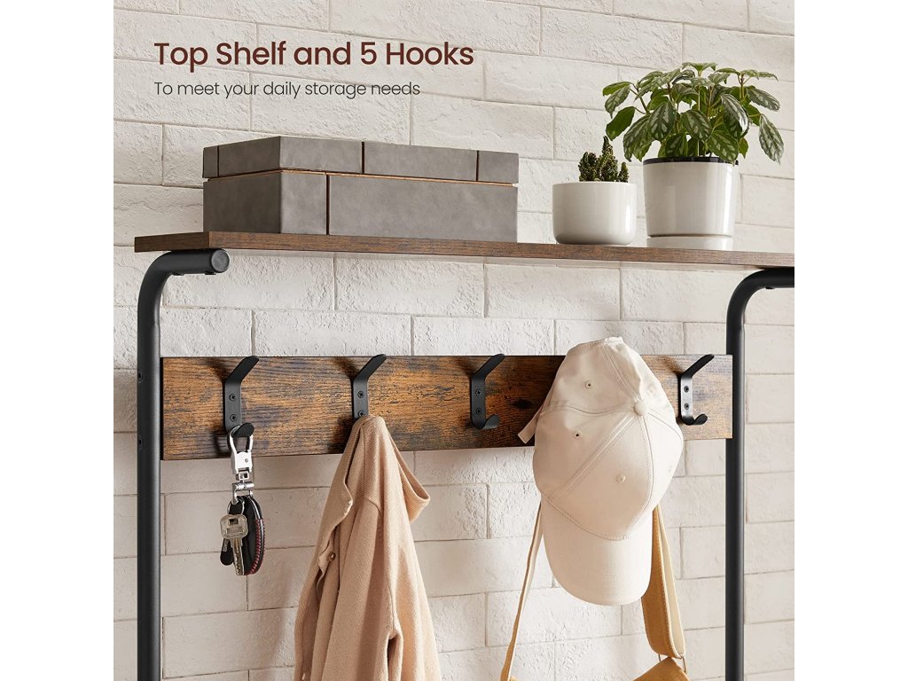 Vrchní část věšáku může posloužit jako polička pro odložení čepic, nebo kufříku, popřípadě jako místo pro dekoraci a do spodní části můžete umístit spoustu bot.