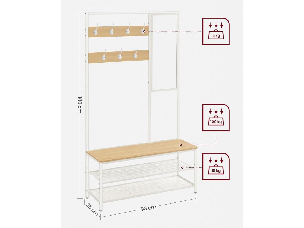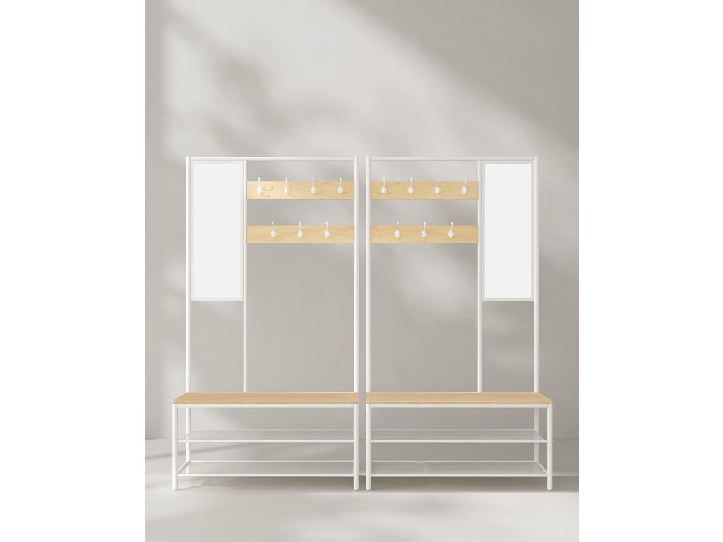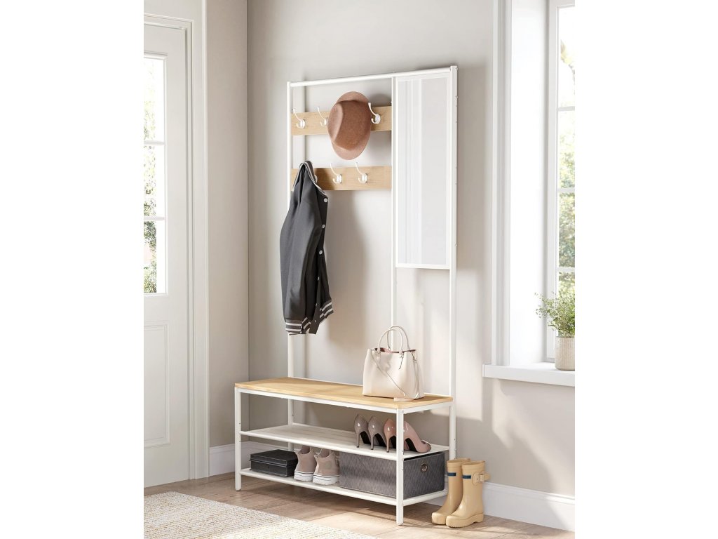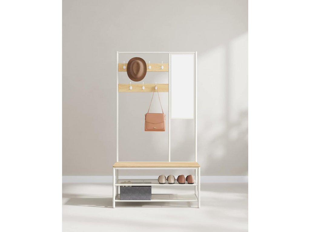Víceúčelový věšák do předsíně má 7 háčků, 98 cm širokou lavici, 2 police a 1 zrcadlo. Na tento věšák 4 v 1 můžete umístit vše, co potřebujete, než vyrazíte ze dveří - oblečení, tašky, klobouky a boty.