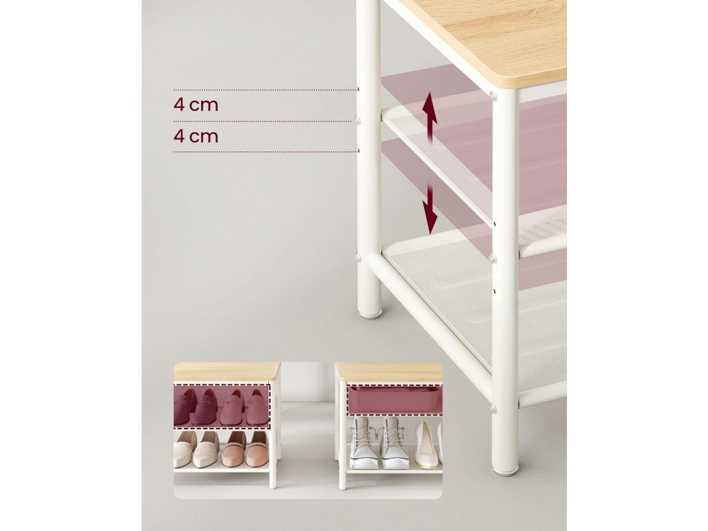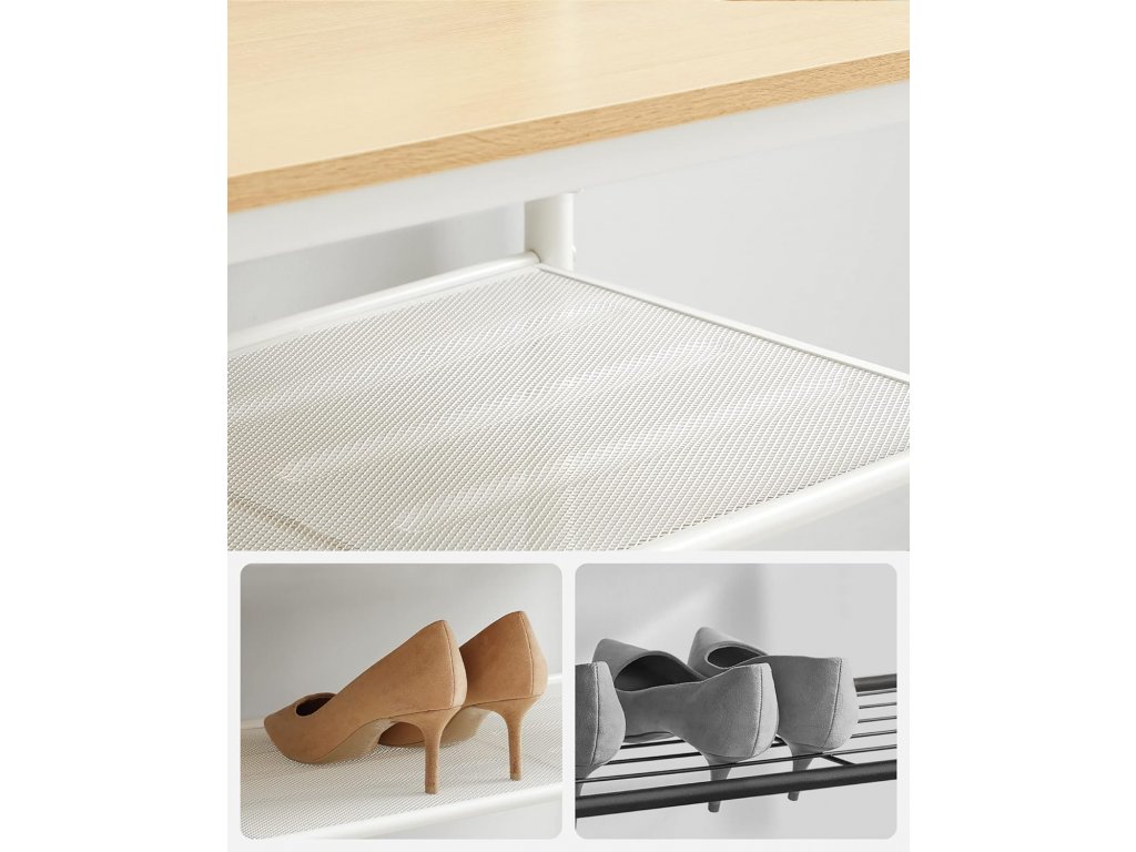 Hustě síťované police jsou ideální pro vysoké podpatky a zabraňují jejich uvíznutí. Středovou polici lze nastavit o 4 cm nahoru nebo dolů, aby se do ní vešly baleríny, žabky, tenisky nebo kozačky.