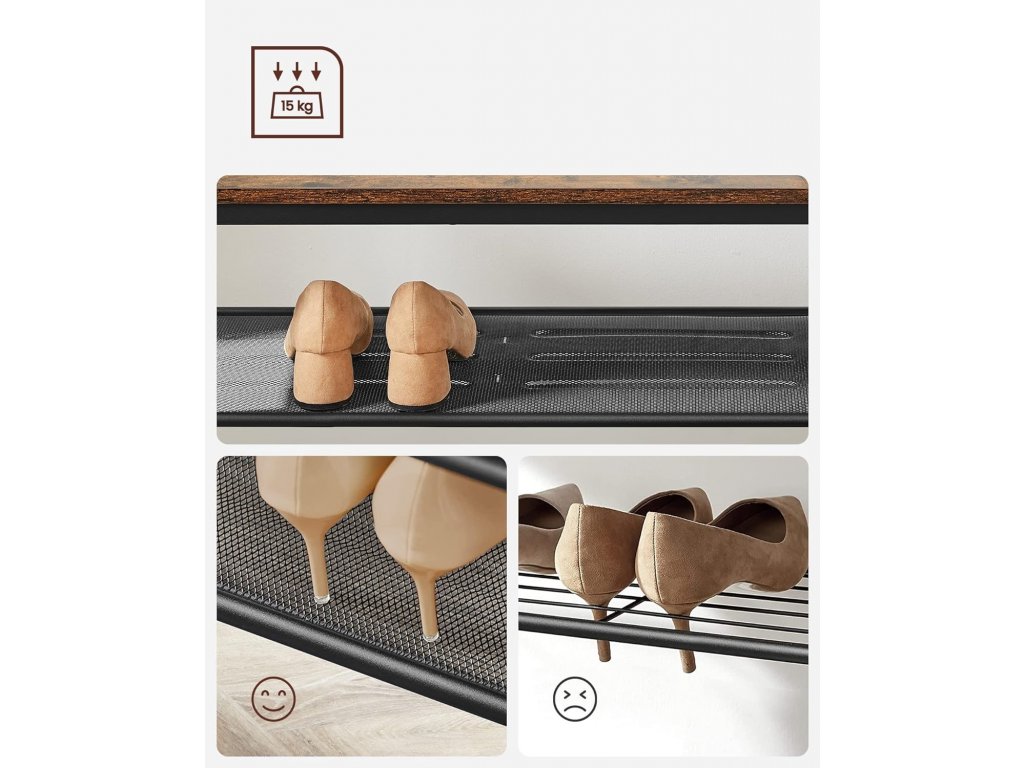 Díky ocelovému rámu a dřevotřískovým deskám je tento kus nábytku do předsíně robustní a na lavici unese až 100 kg. 4 nastavitelné nožky udržují rovnováhu. Můžete se posadit, odpočívat a bez obav se přezouvat!