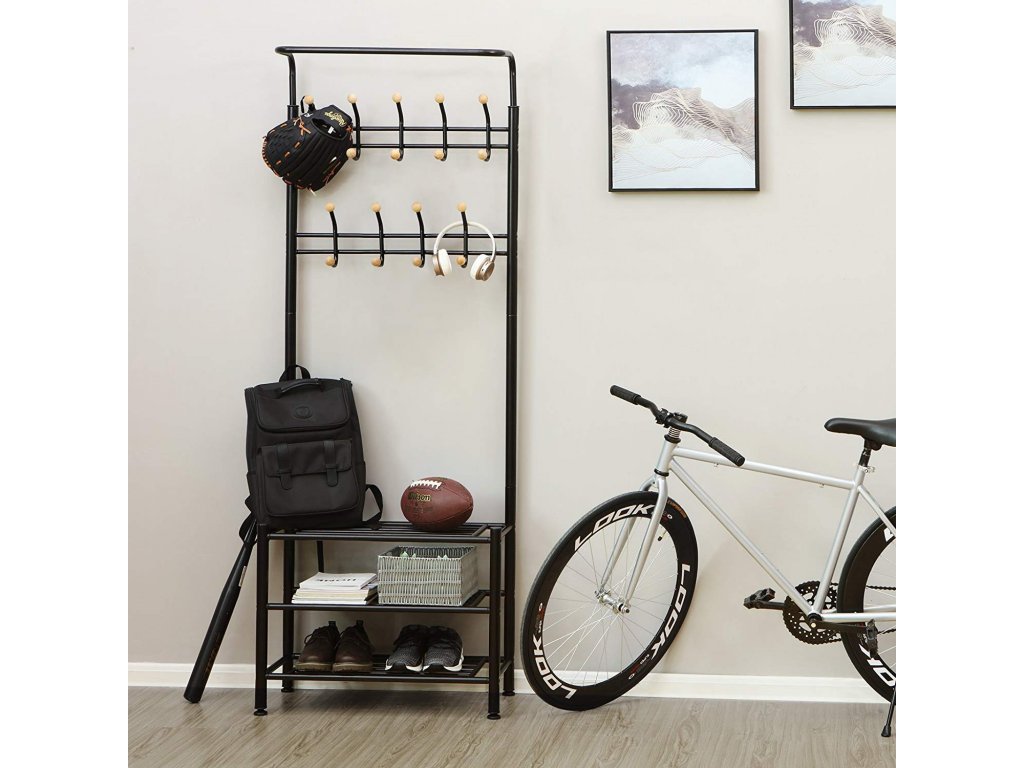 Dostatečně prostorný stojan na oblečení s 18 háčky (nosnost každého háku: 5 kg) a třístupňovým odkládacím stojanem, kam uložíte cokoli, jako je oblečení, boty a tašky.