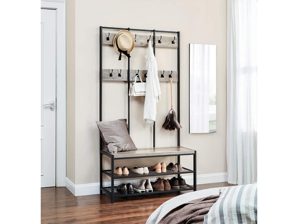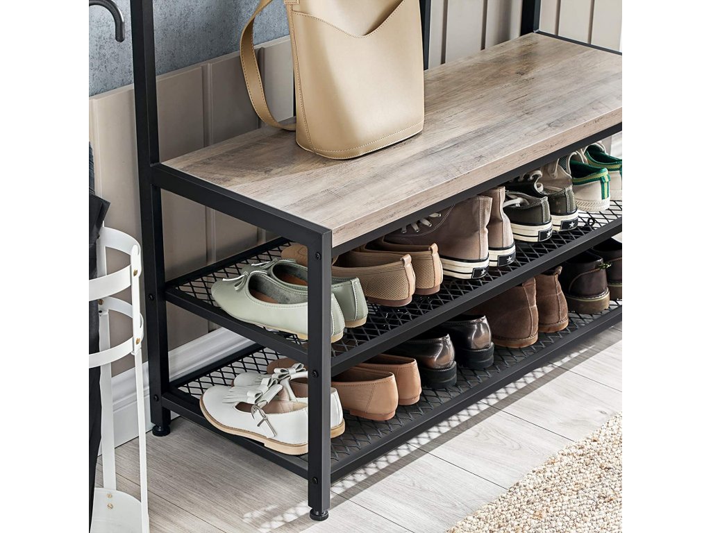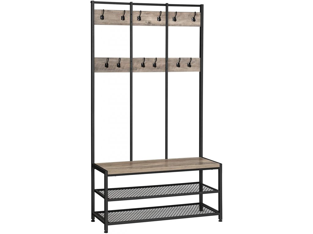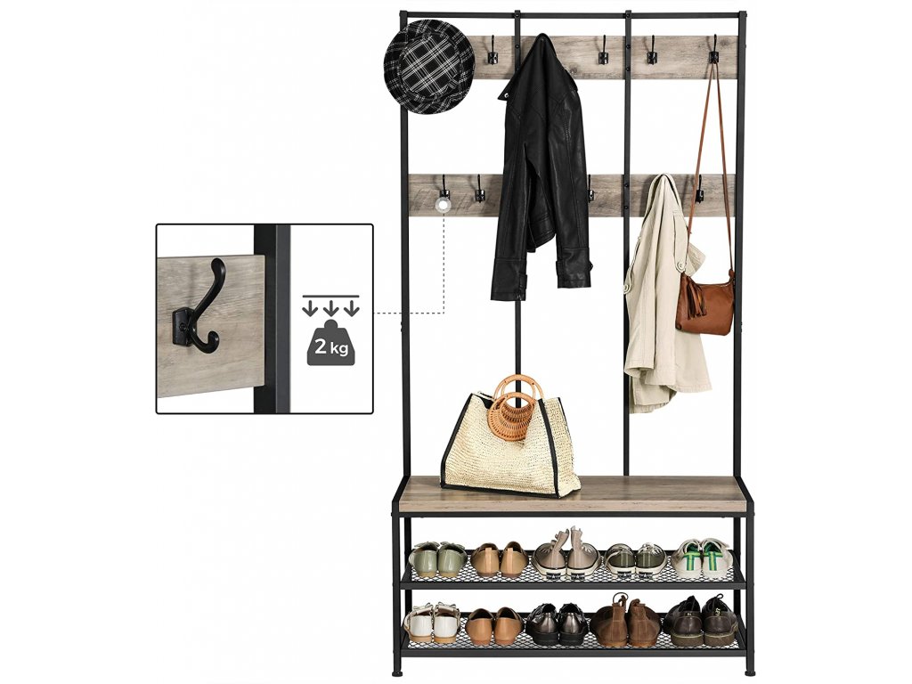 Kabátový stojan s lavičkou, která vám poskytne pohodlné sedadlo, 2 police z mřížkami pro uložení bot a 12 háčků pro organizování oblečení.