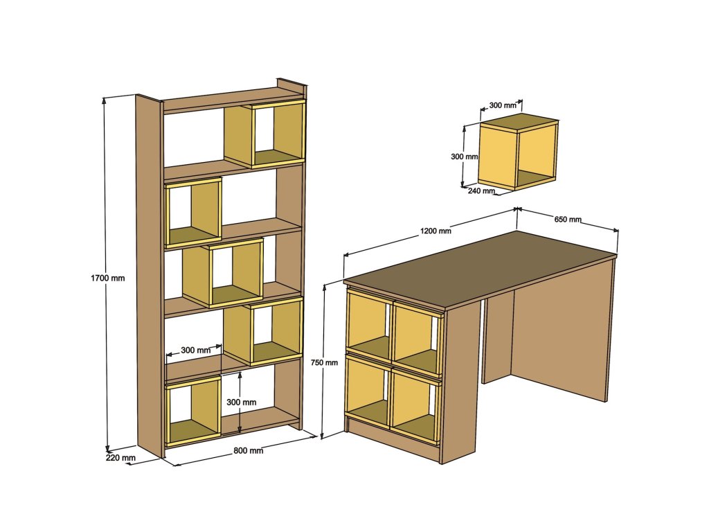 Skládá se z pracovní desky, která nabízí dostatek místa pro práci na PC, učení i další studentské a kancelářské činnosti. Zásuvky jsou v tomto případě nahrazeny stylovými variabilními boxy ve tvaru otevřených kvadrátů.
