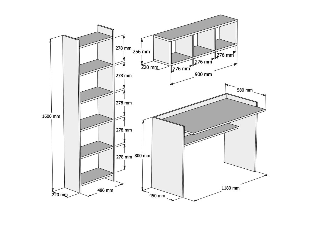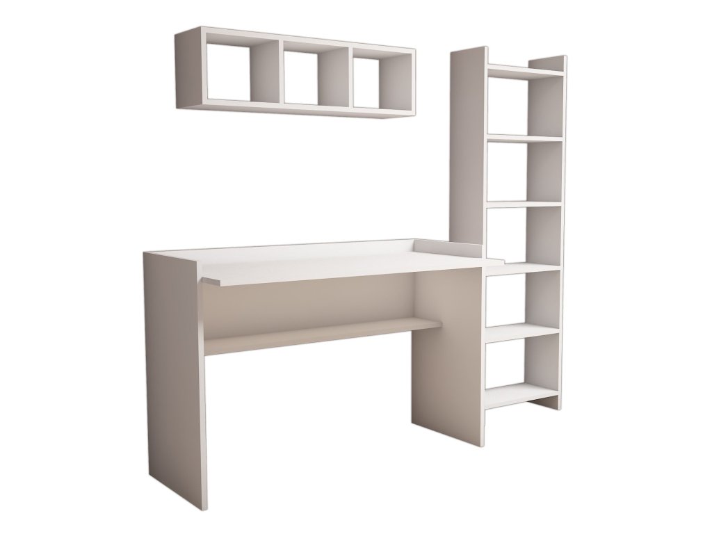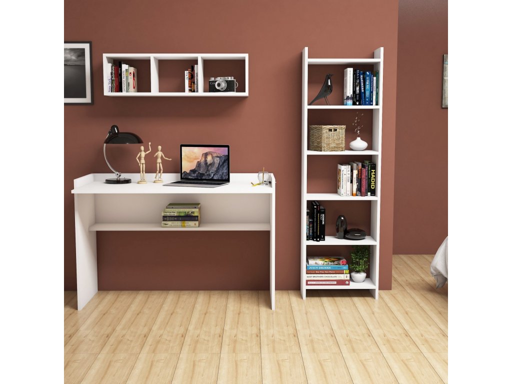 Sestava obsahuje psací pracovní stůl s dostatečně velkou deskou, prostornou policovou knihovnou a designovou nástěnnou policí.