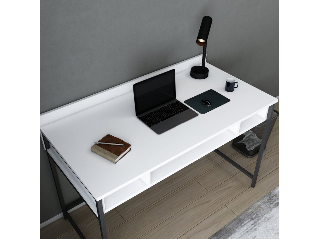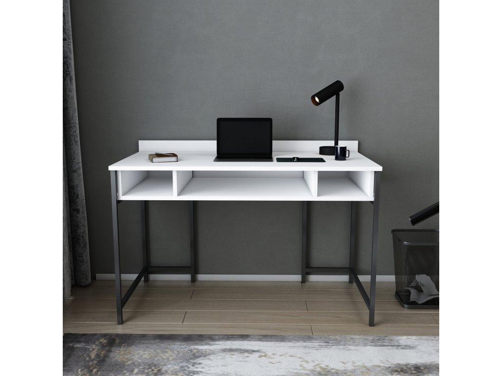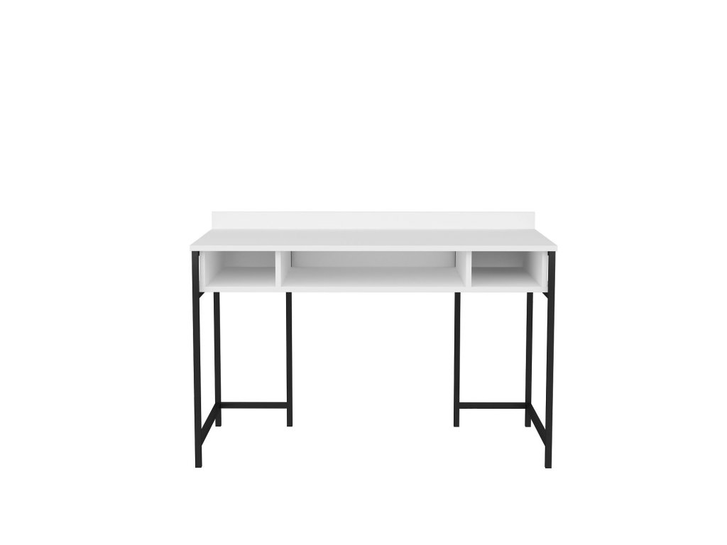 ALMA je praktický psací stůl s vzadu vyvýšenou bílou pracovní deskou a třemi bílými regály ukotvenými v černé kovové konstrukci tvořící stabilní nohy stolu.