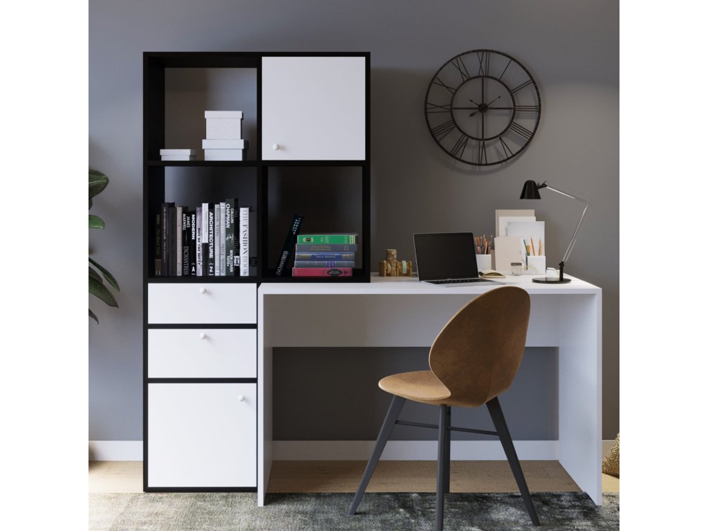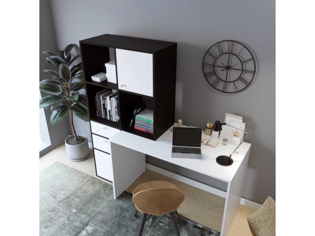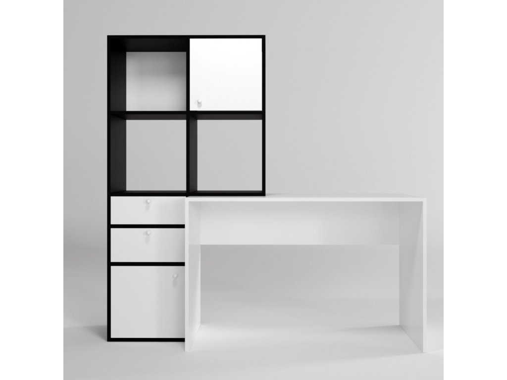 Bílý psací stůl CANNES je tvořen bílou pracovní deskou a stejnou barvu nesou obě čela zásuvek a dvířka obou skříněk, tělo levé části stolu je černé.