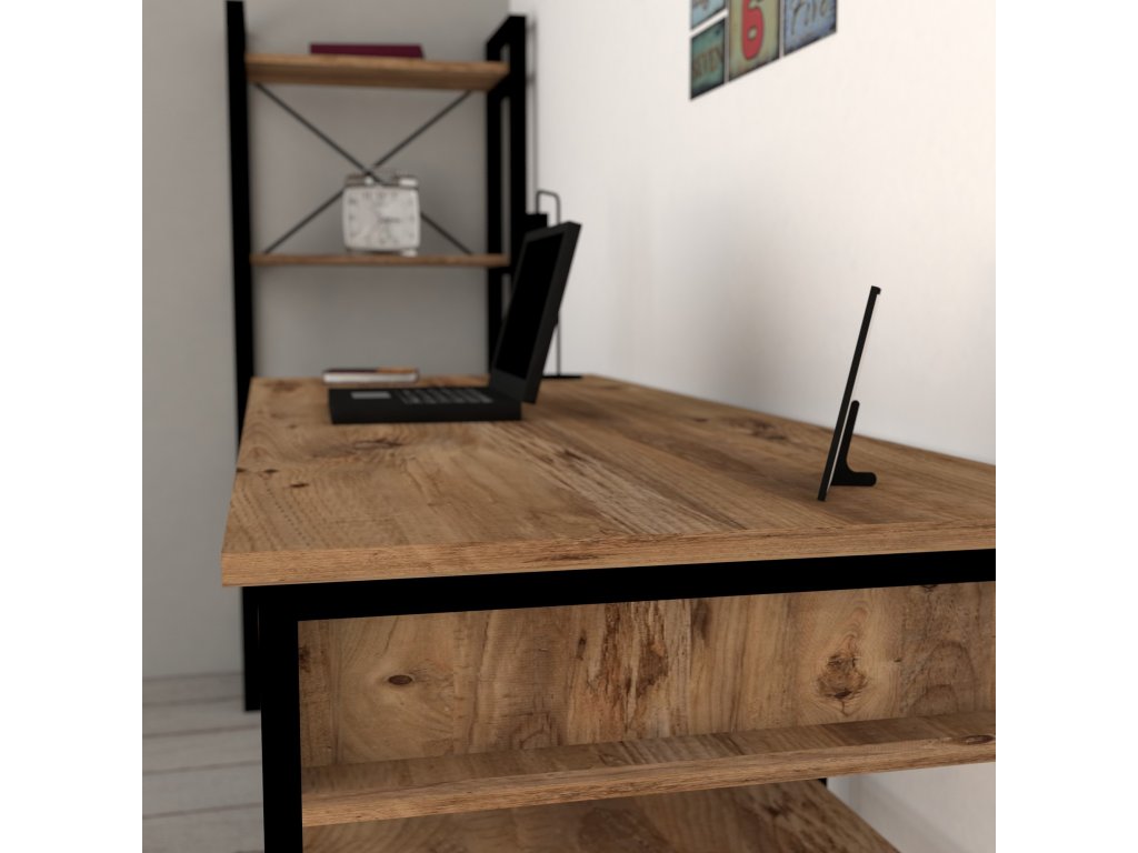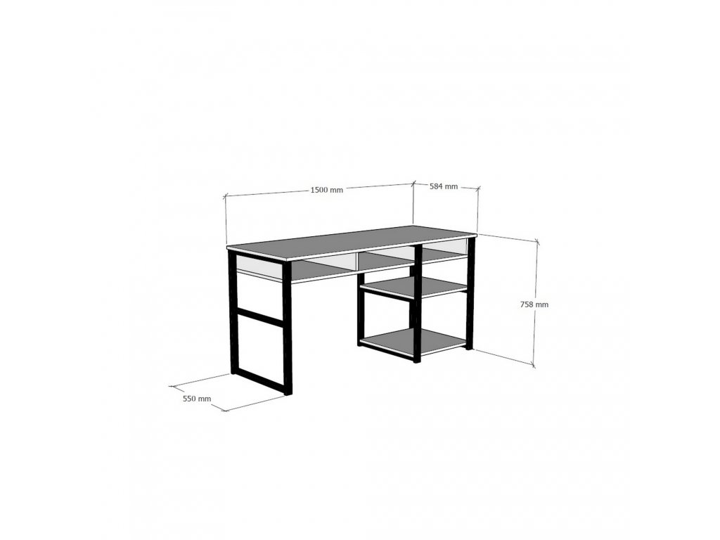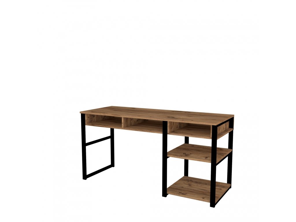 Stůl stojí na silných kovových nohách, tím zaručuje stabilitu. Do otevřených polic můžete uložit dokumenty nebo psací potřeby.