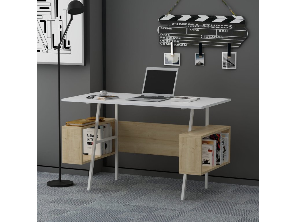 Psací stůl IRONI má na obou stranách na kovových nohách upevněné odkládacími regály spojené zadní shodně v dekoru dub a nad nimi jakoby se vznášela bílá pracovní deska.