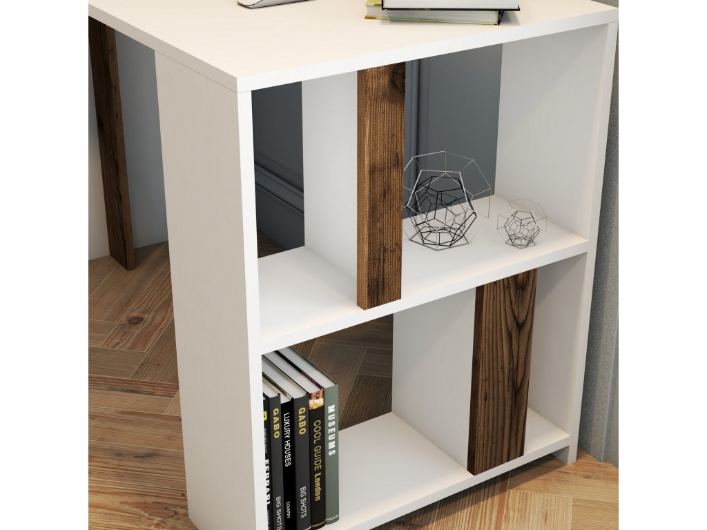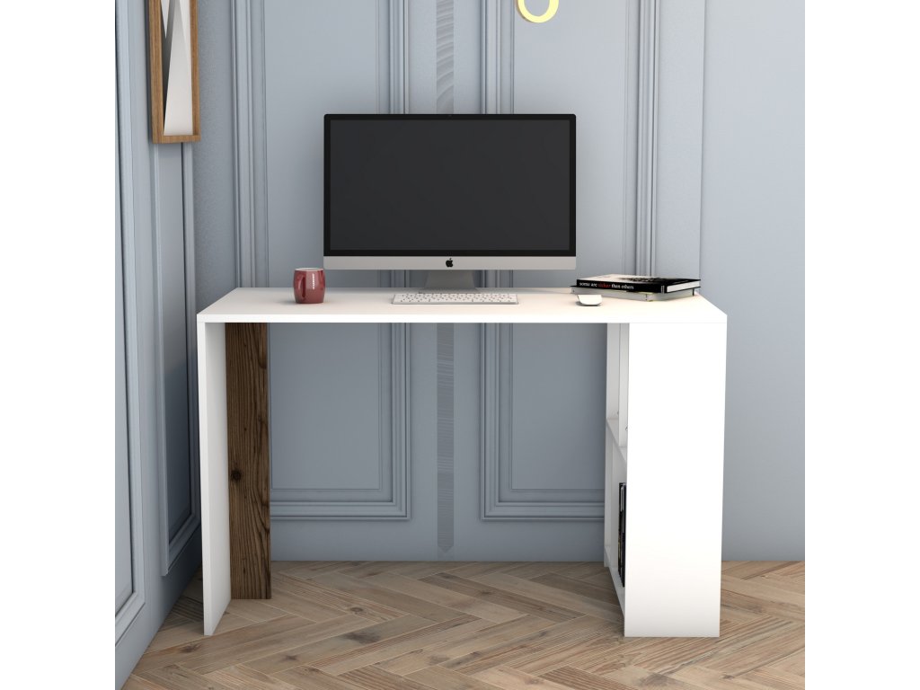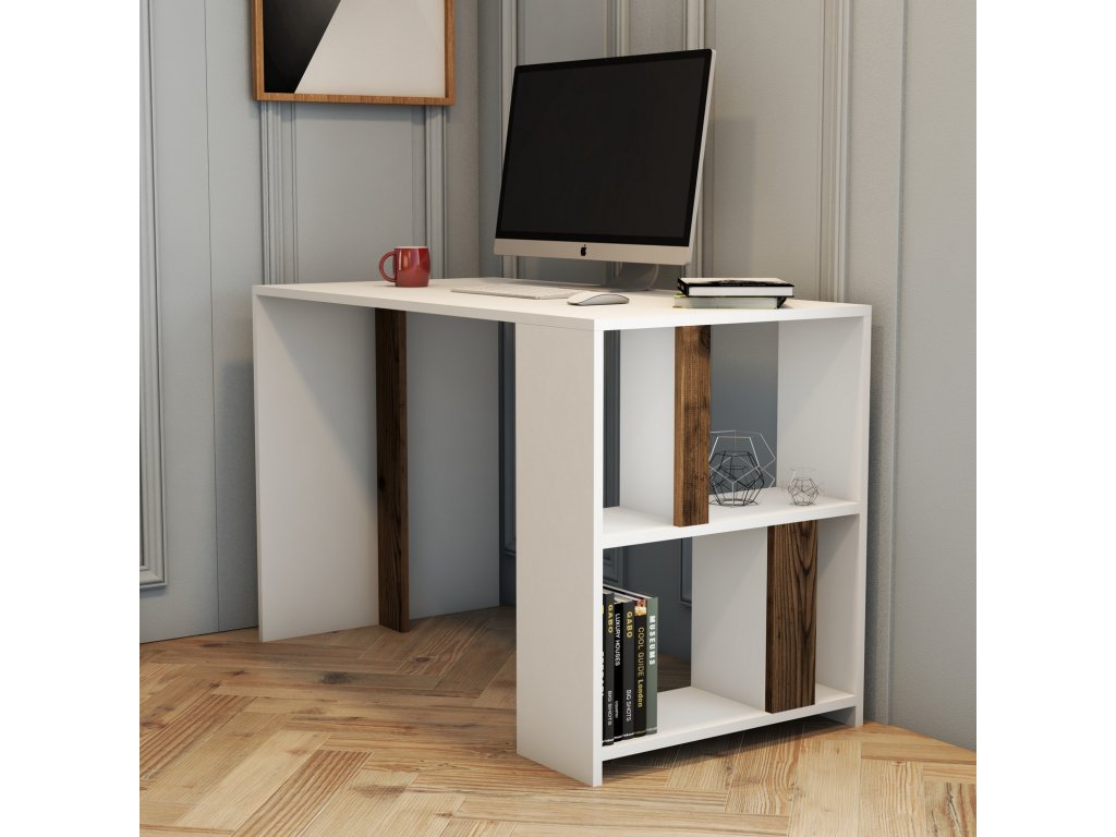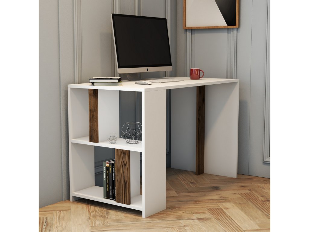 Bílý psací stůl LIMA je skvělou kombinací bílého psacího stolu, jenž má místo jedné strany nohou čtyř-regálovou knihovnu s příčkami a ořechovými čely.